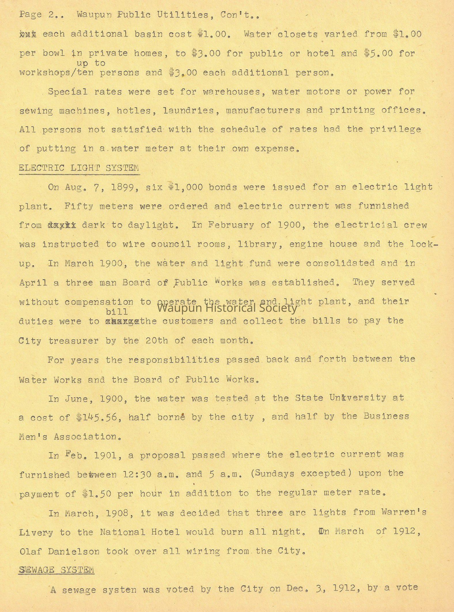 Historical information on Waupun Public Utilities for 1976 Bicentennial Celebration in Waupun, WI.