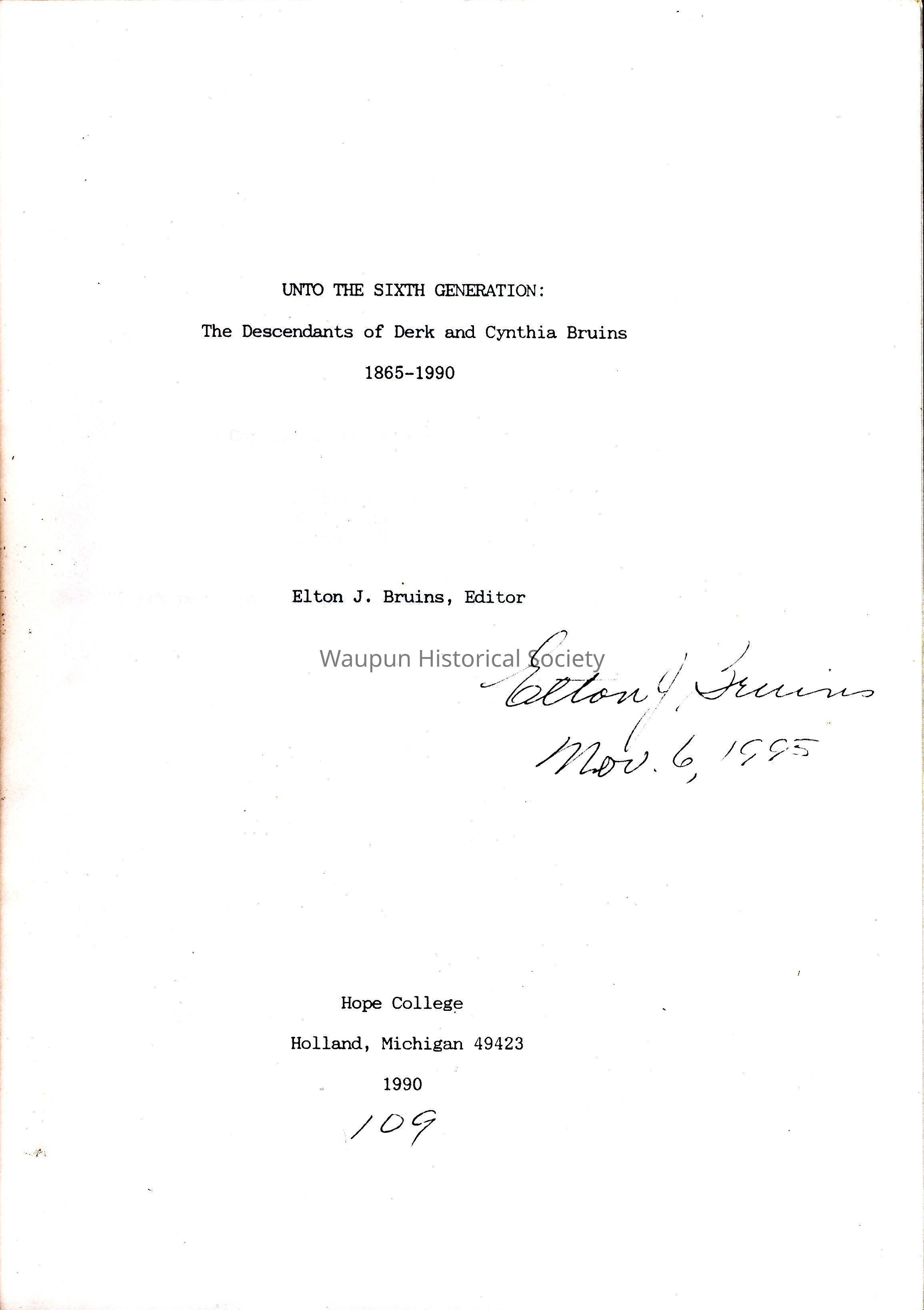 Family black genealogy labeled Bruins, 1990. Inside front page it indicates "Unto The Sixth Generation, The Descendants of Derk and Cynthia Bruines, 1865 - 1990. Contains 161 pages. Contains photos. Photocopy of as 2008.0012.0002.