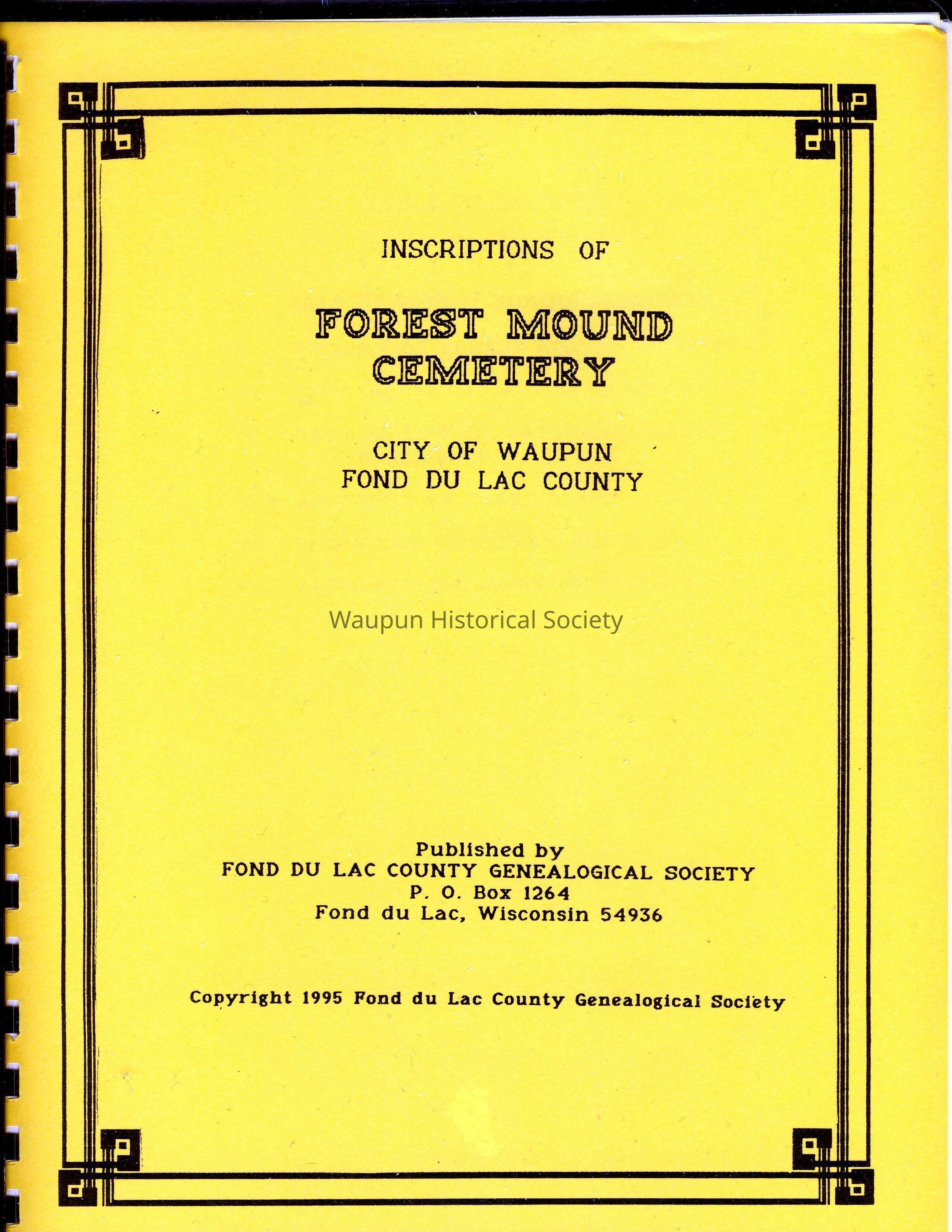 Inscriptions of FOREST MOUND CEMETERY. Dated 1995, listing burials at Forest Mound Cemetery, Waupun, Fond du Lac, WI. In the back is a comprehensive index. Contains a map of Forest Mound showing the various devisions.Acquisition