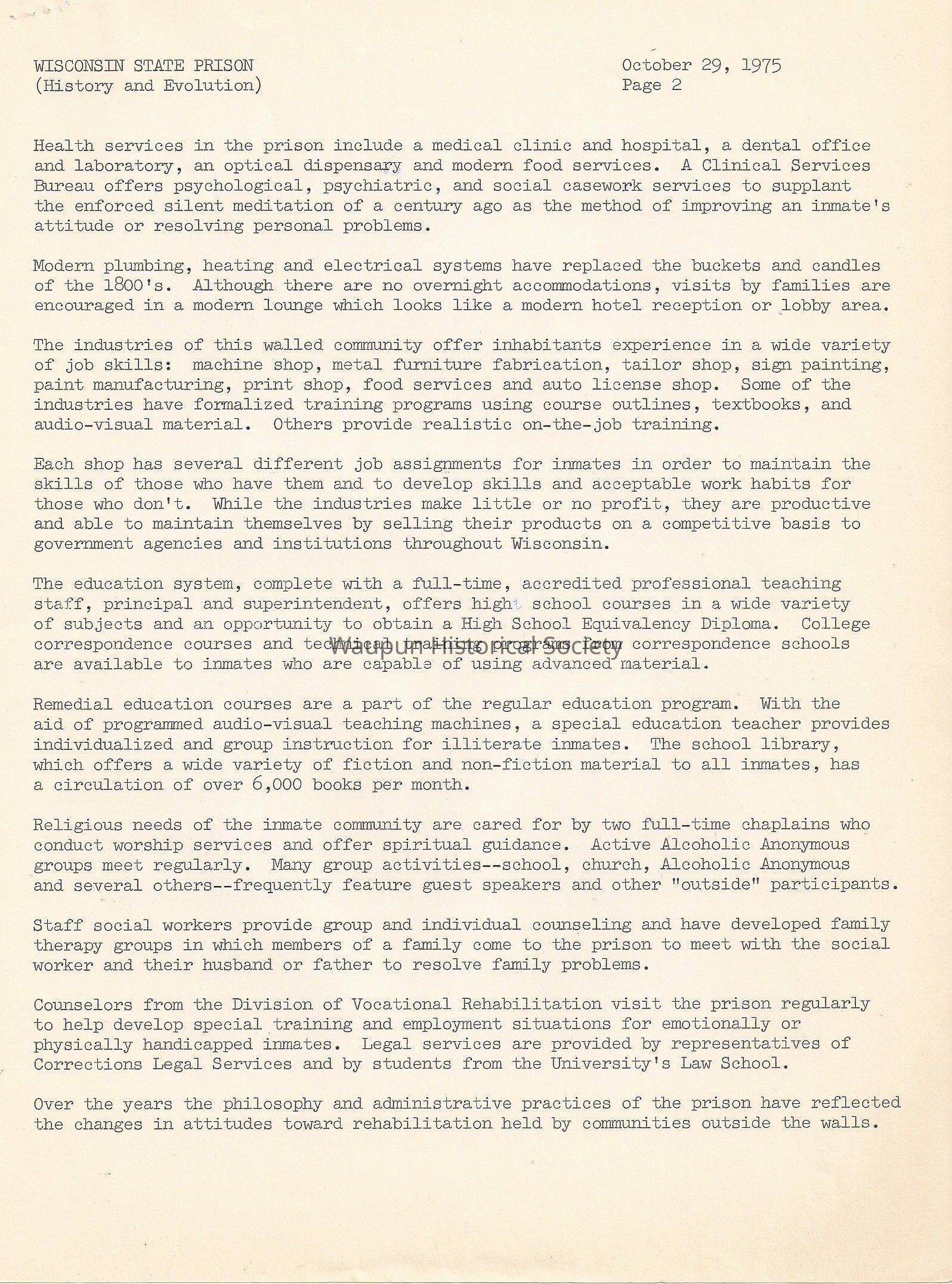 Historical information on Wisconsin State Prison for 1976 Bicentennial Celebration in Waupun, WI.