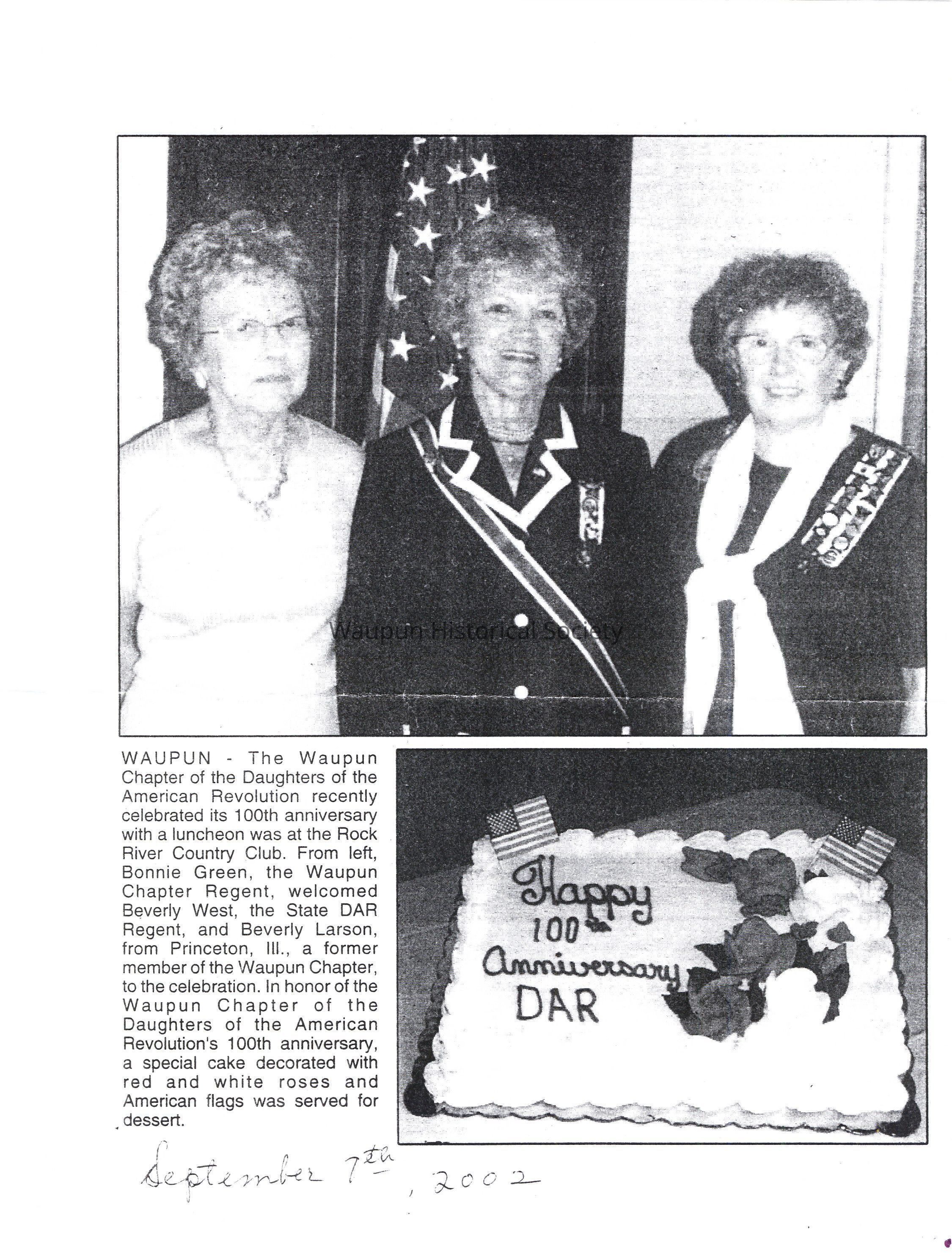 WAUPUN - The Waupun Chapter of the Daughters of the American Revolution recently celebrated its 100th anniversary with a luncheon was at the Rock River Country Club. From left, Bonnie Green, the Waupun Chapter Regent, welcomed Beverly West, the State DAR Regent, and Beverly Larson, from Princeton, Ill., a former member of the Waupun Chapter, to the celebration. In honor of the Waupun Chapter of the Daughters of the American Revolution's 100th anniversary, a special cake decorated with red and white roses and American flags was served for dessert.Acquisition