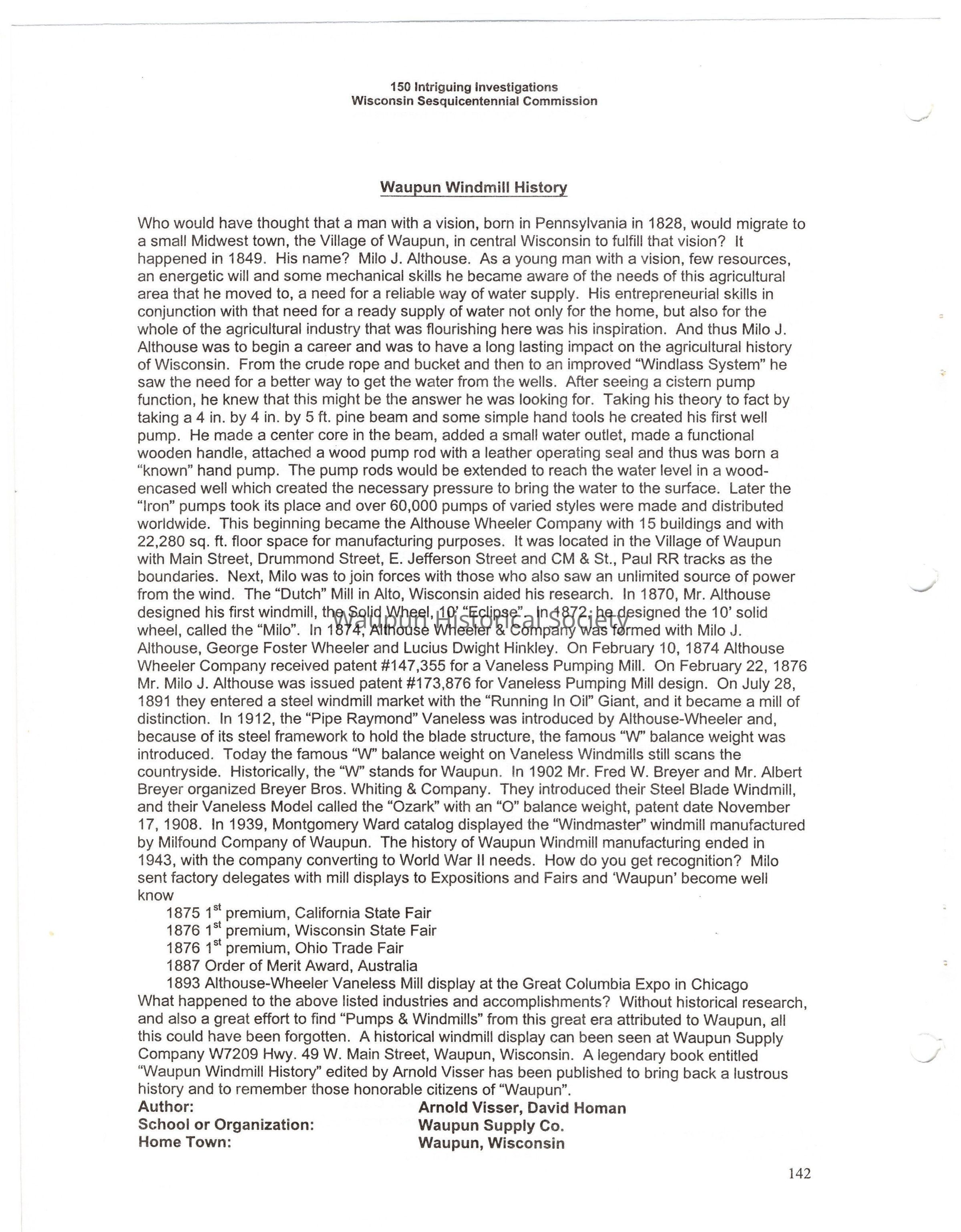 Page 142 is about Waupun and the inventtion of the windmill by Milo Althouse