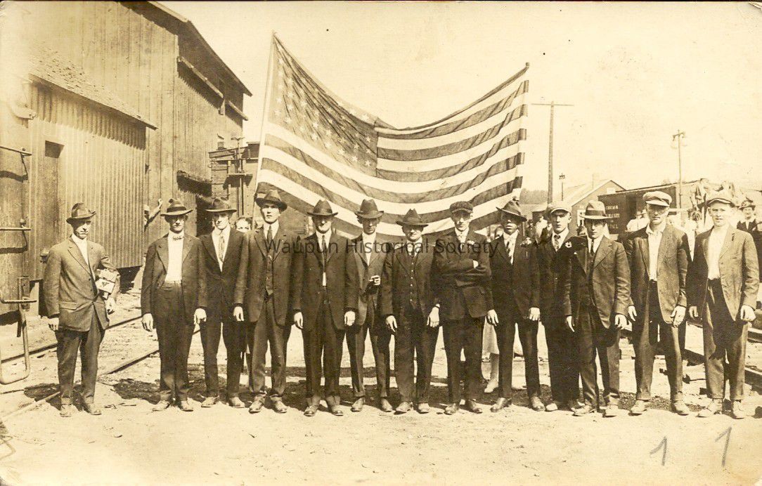 Postcard from WWI era, appears to have been taken at the Waupun Rail Road Depot, of troops preparing to leave for military training. The men standing in front of the U.S. Flag, may be the same men pictured in the postcard accession # 2012.0003.0002. The assumption made of who, when and where is based on RR tracks, building and clothing styles, hats and the man with packages in arm.
