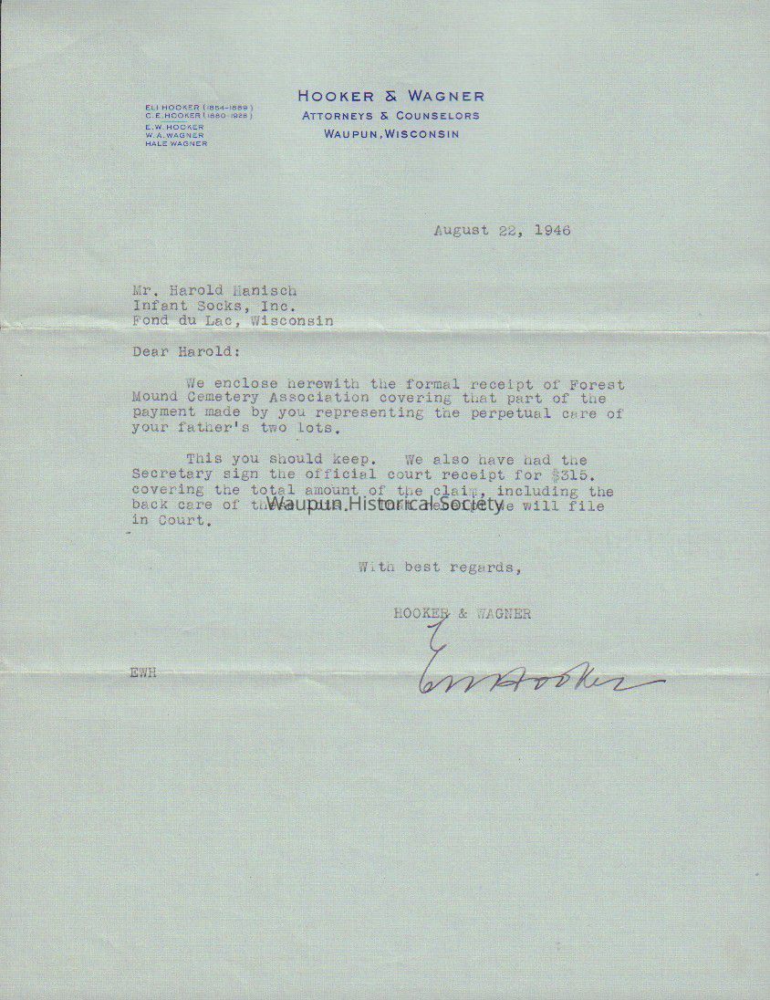 Cemetery, Forest Mound, Attorney Letter. Letter to Mr. Harold Hanisch from Hooker & Wagner Attorneys & Counselors, Waupun, Wisconsin, on HOOKER & WAGNER letterhead paper regarding receipts for care of father's two lots (Charles Hannish).
