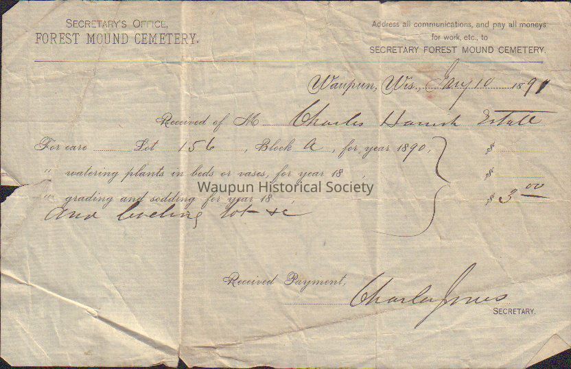 Cemetery, Forest Mound, Receipt, Charles Hanisch. Receipt from Secretary's Office, Forest Mound Cemetery, dated May 10, 1891.