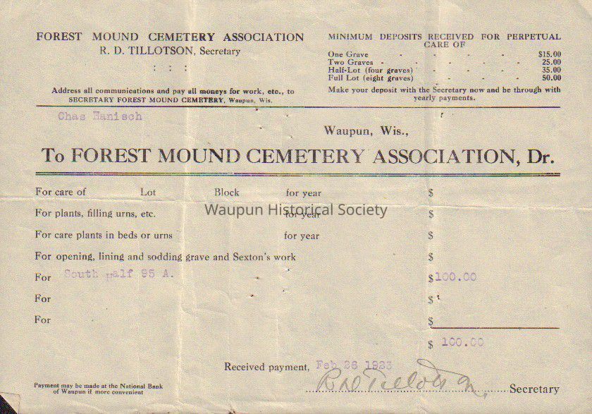 Address all communications and pay all moneys for work, etc., to SECRETARY FOREST MOUND CEMETERY. Waupun, Wis.