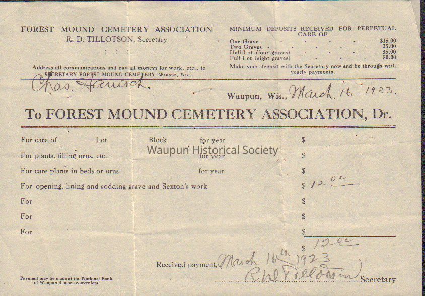 Cemetery, Forest Mound, Receipt, Charles Hanisch. Receipt from Secretary's Office, Forest Mound Cemetery, dated March 16, 1923.