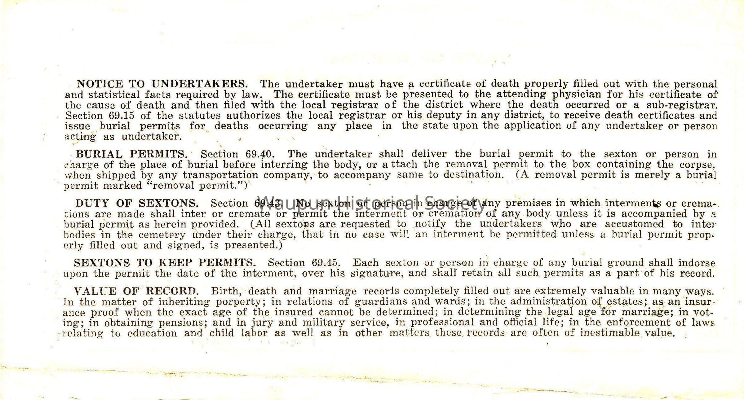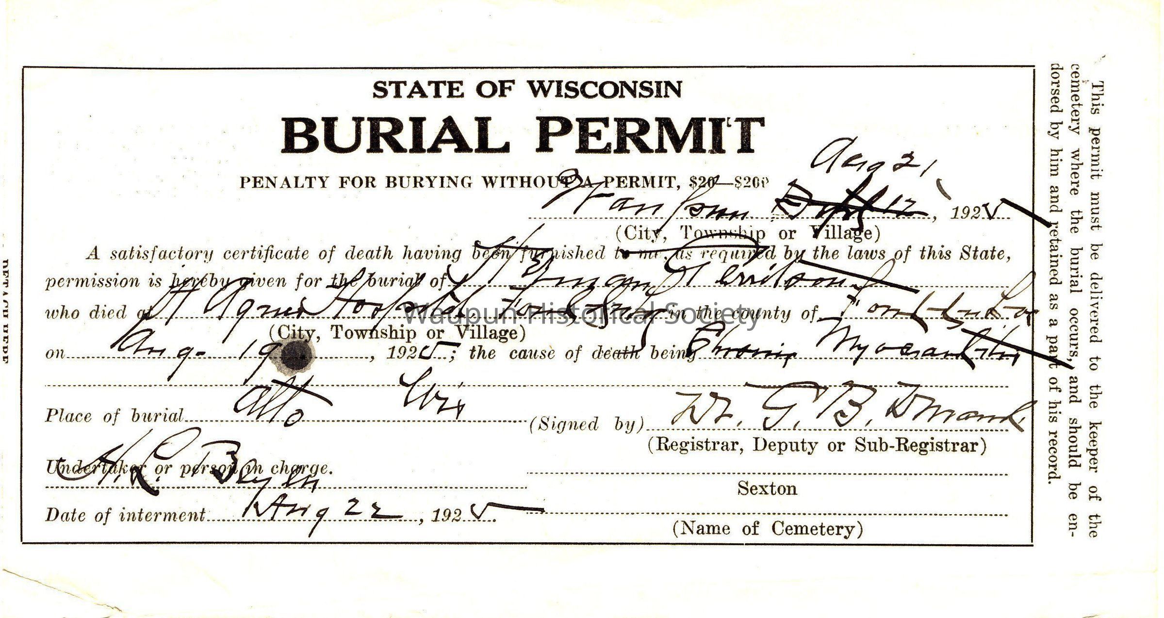 State of Wisconsin Burial Permit: Herman GerritsonEntry/Object ID
