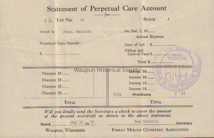 Statement, Forest Mound Cemetery, Ben Kastein, Secretary, Harold HanischEntry/Object ID