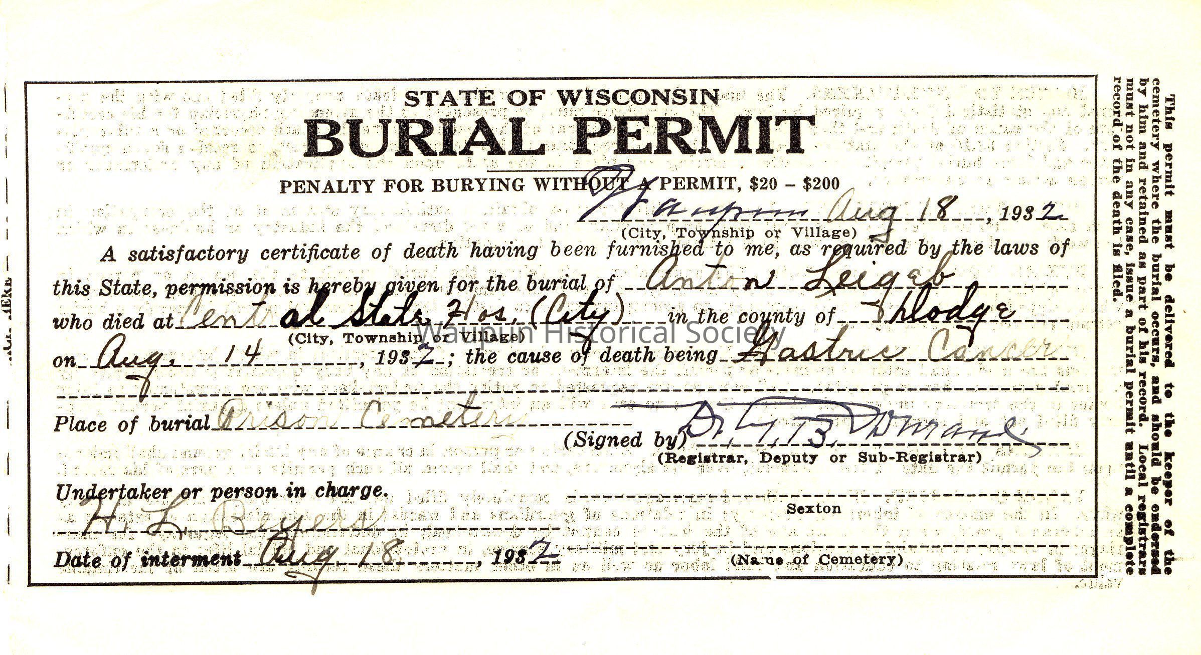 State of Wisconsin Burial Permit for Anton Leigeb, who died at Central State Hospital (City), Dodge County, Wisconsin, August 14, 1932. Cause of death Gastric Cancer. Place of burial: Prison Cemetery. Signed by Dr. G.B. Durand. Undertaker or person in charge: H.L. Beyers, Date of Interment: August 18, 1932.