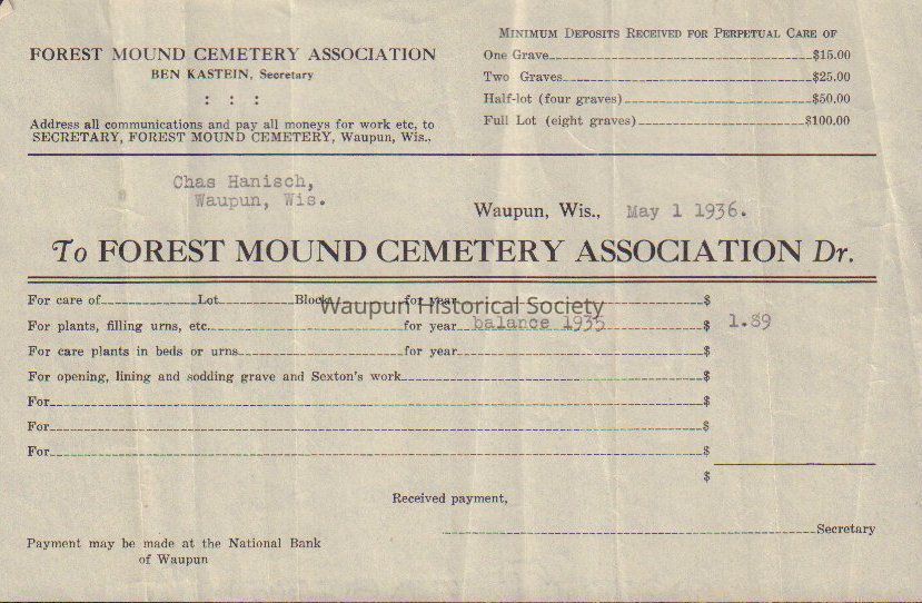 Address all communications and pay all moneys for work etc, to SECRETARY, FOREST MOUND CEMETERY, Waupun, Wis.,