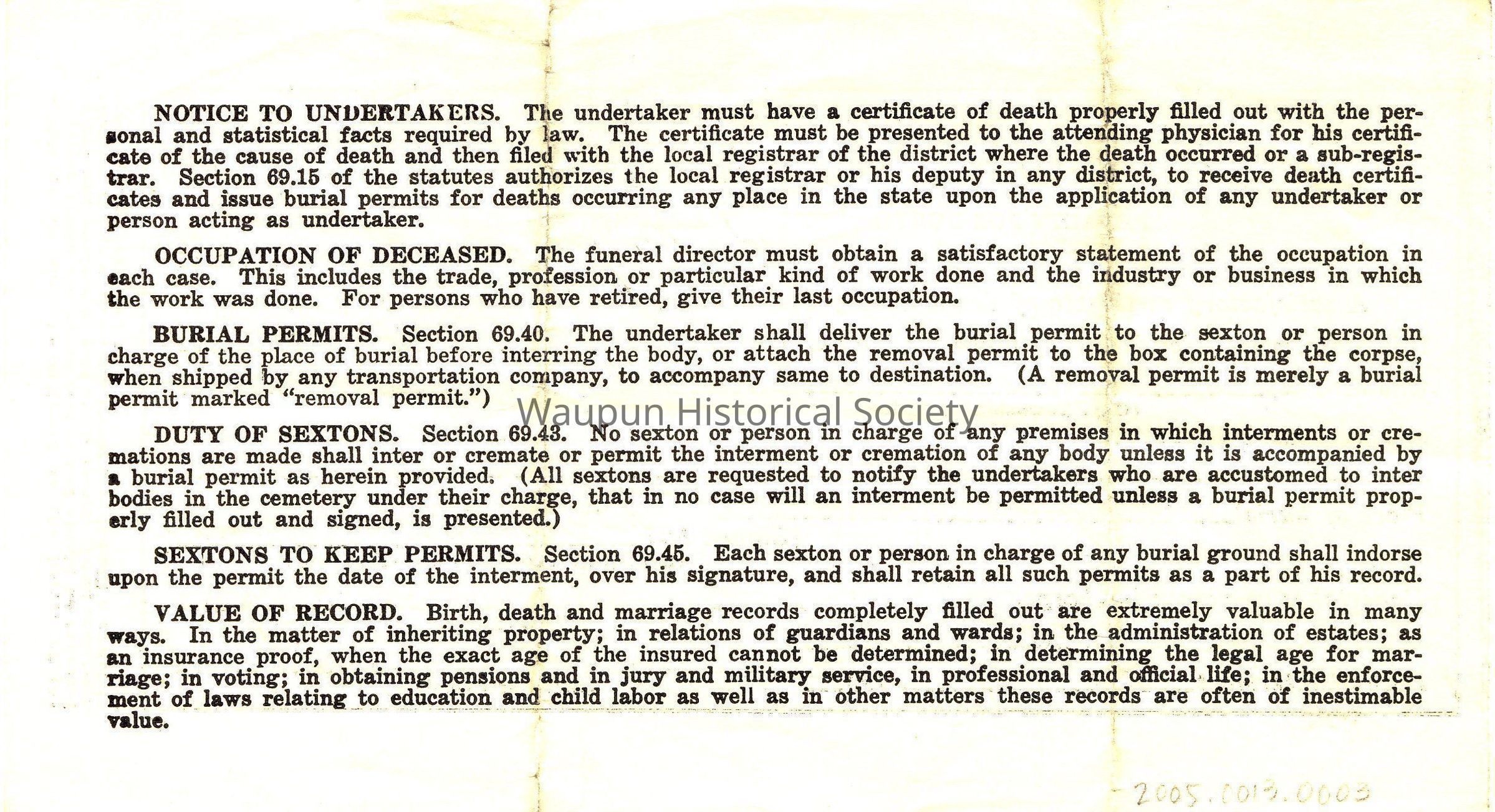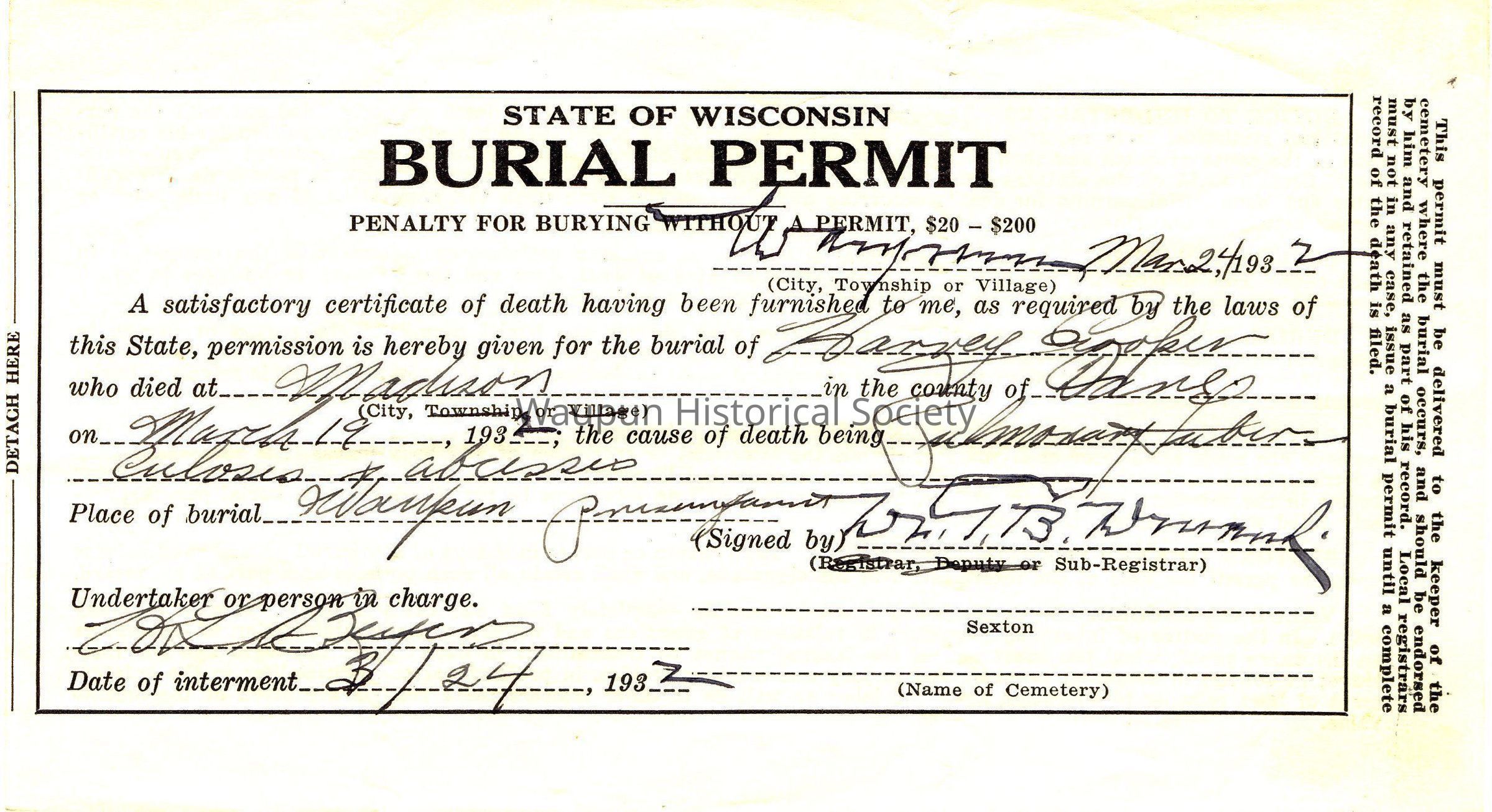 State of Wisconsin Burial Permit: Harvey CooperEntry/Object ID