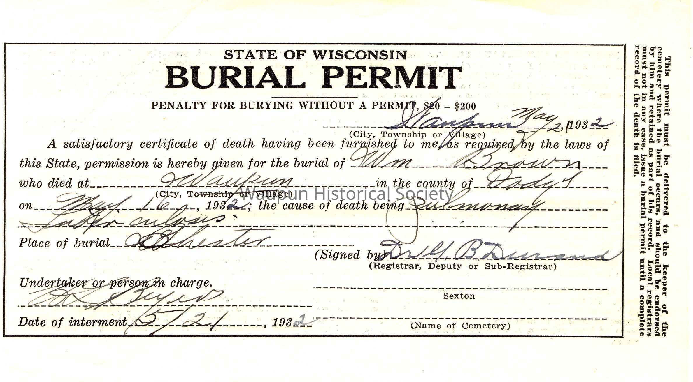 State of Wisconsin Burial Permit for Wm. Brown, who died at Waupun, Dodge County, Wisconsin, May 16, 1932. Cause of death Pulmonary Tuberculosis. Place of burial: Chester. Signed by Dr. G.B. Durand. Undertaker or person in charge: H.L. Beyers, Date of interment: May 21, 1932.