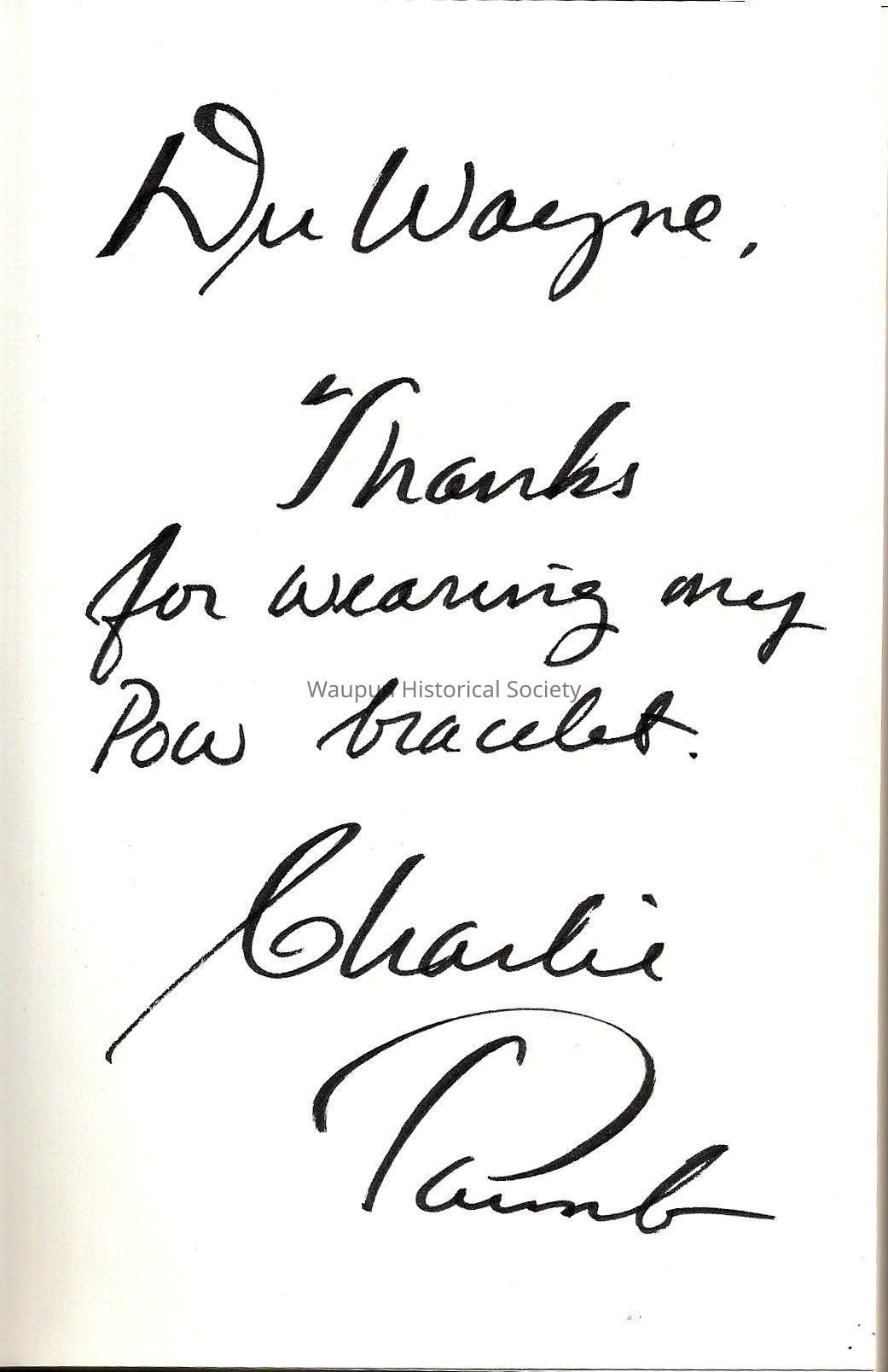 Words written on the second page of the book: "DuWayne, Thanks for wearing my POW bracelet. Charlie Plumb."