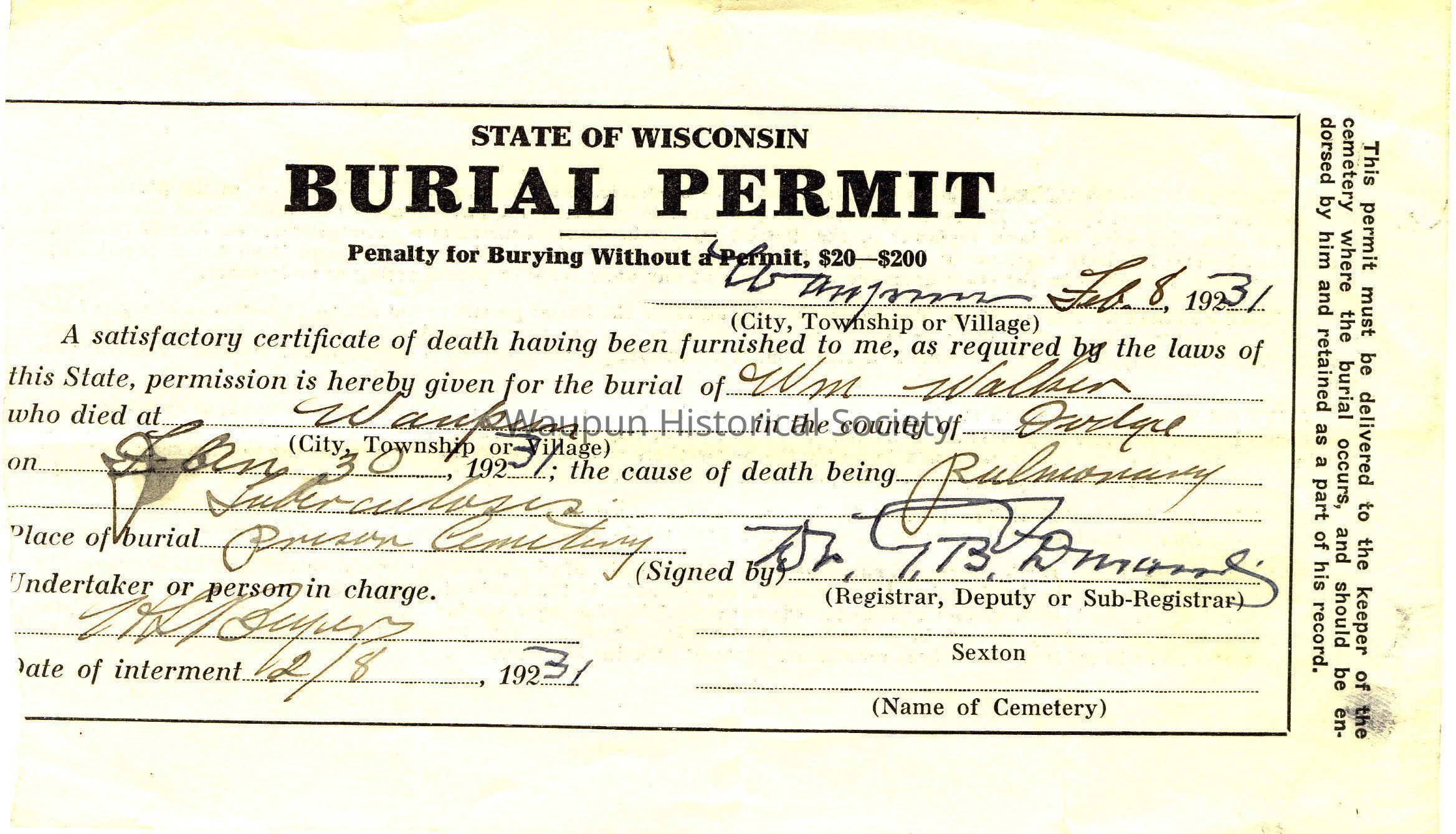 State of Wisconsin Burial Permit for Wm Walker, who died at Waupun, Dodge County, Wisconsin, January 30, 1931. Cause of death Pulmonary Tuberculosis. Place of burial: Prison Cemetery. Signed by Dr. G.B. Durand. Undertaker or person in charge: H.L. Beyers, Date of interment: February 8, 1931.