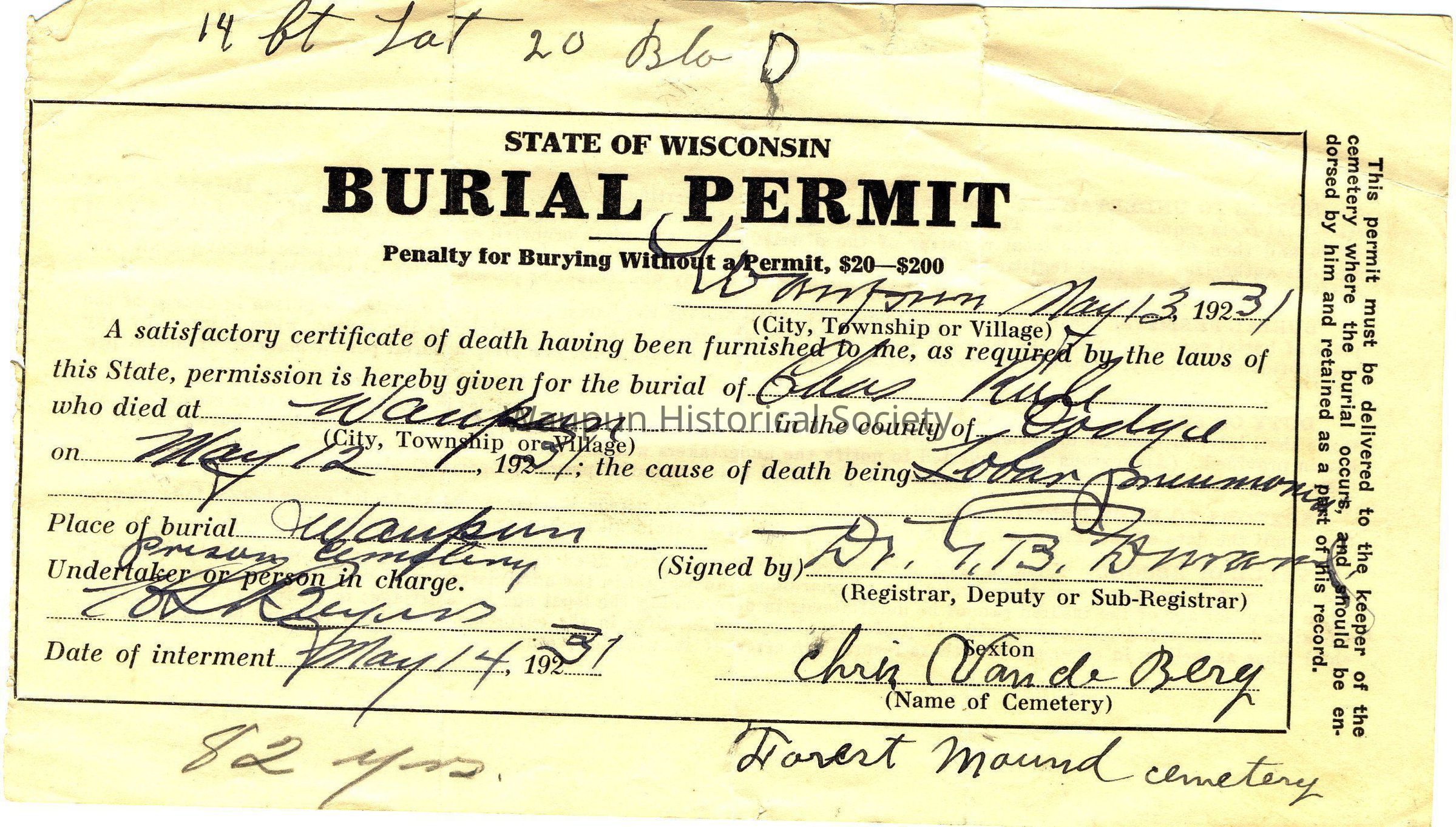State of Wisconsin Burial Permit for Chas Rule, who died at Waupun, Dodge County, Wisconsin, May 12, 1931. Cause of death (unreadable--perhaps Lobar) Pneumonia. Place of burial: Prison Cemetery. Signed by Dr. G.B. Durand. Undertaker or person in charge: H.L. Beyers, Date of interment: May 14, 1931. Name of Sexton: Chris Vande Berg, Cemetery: Forest Mound Cemetery.