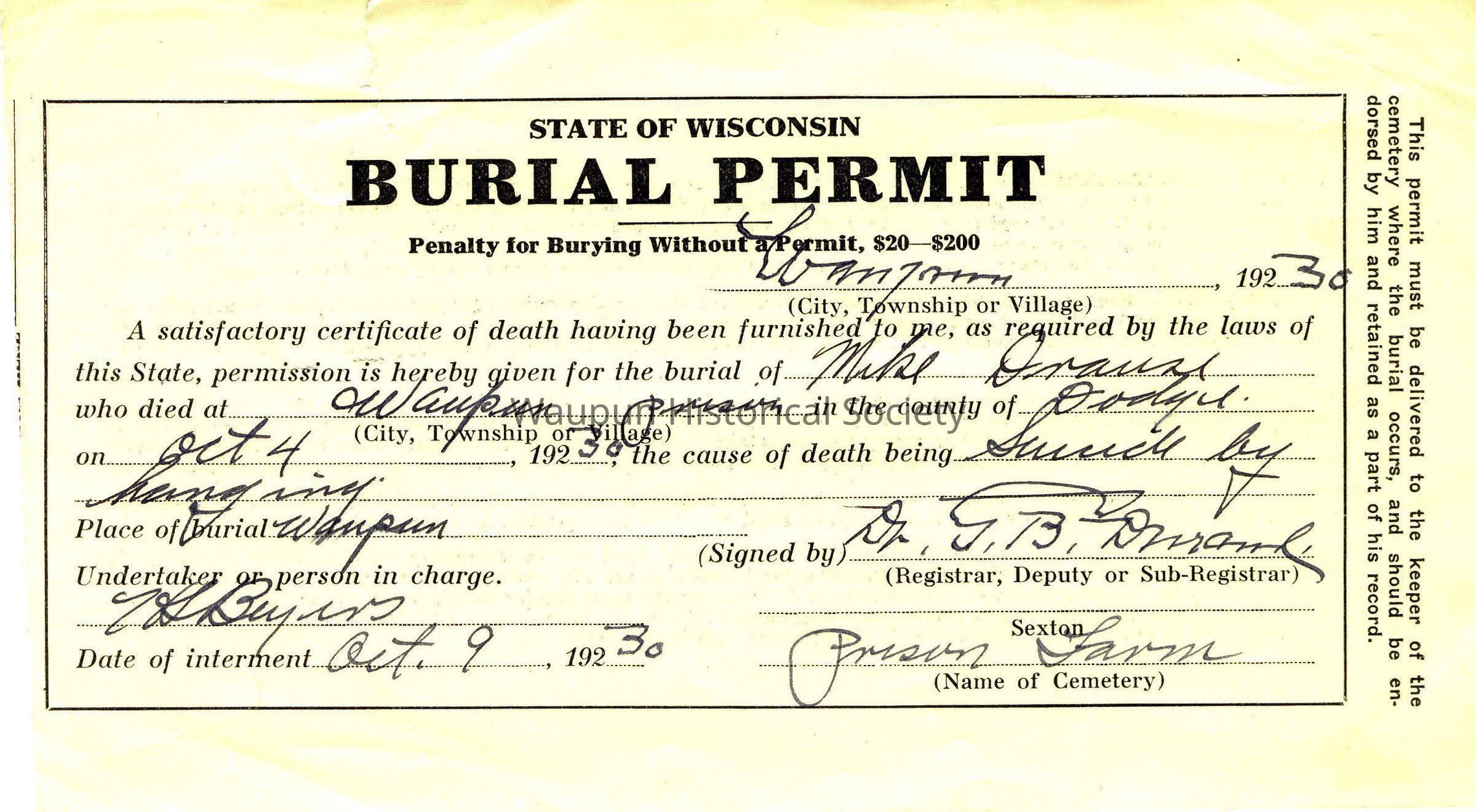 State of Wisconsin Burial Permit for Mike Drause, who died at Waupun Prison, in the county of Dodge, Wisconsin, October 4, 1930. Cause of death Suicide by Hanging. Place of burial: Waupun Prison Farm. Signed by Dr. G. B. Durand. Undertaker or person in charge: H. L. Beyers. Date of interment: October 9, 1930.