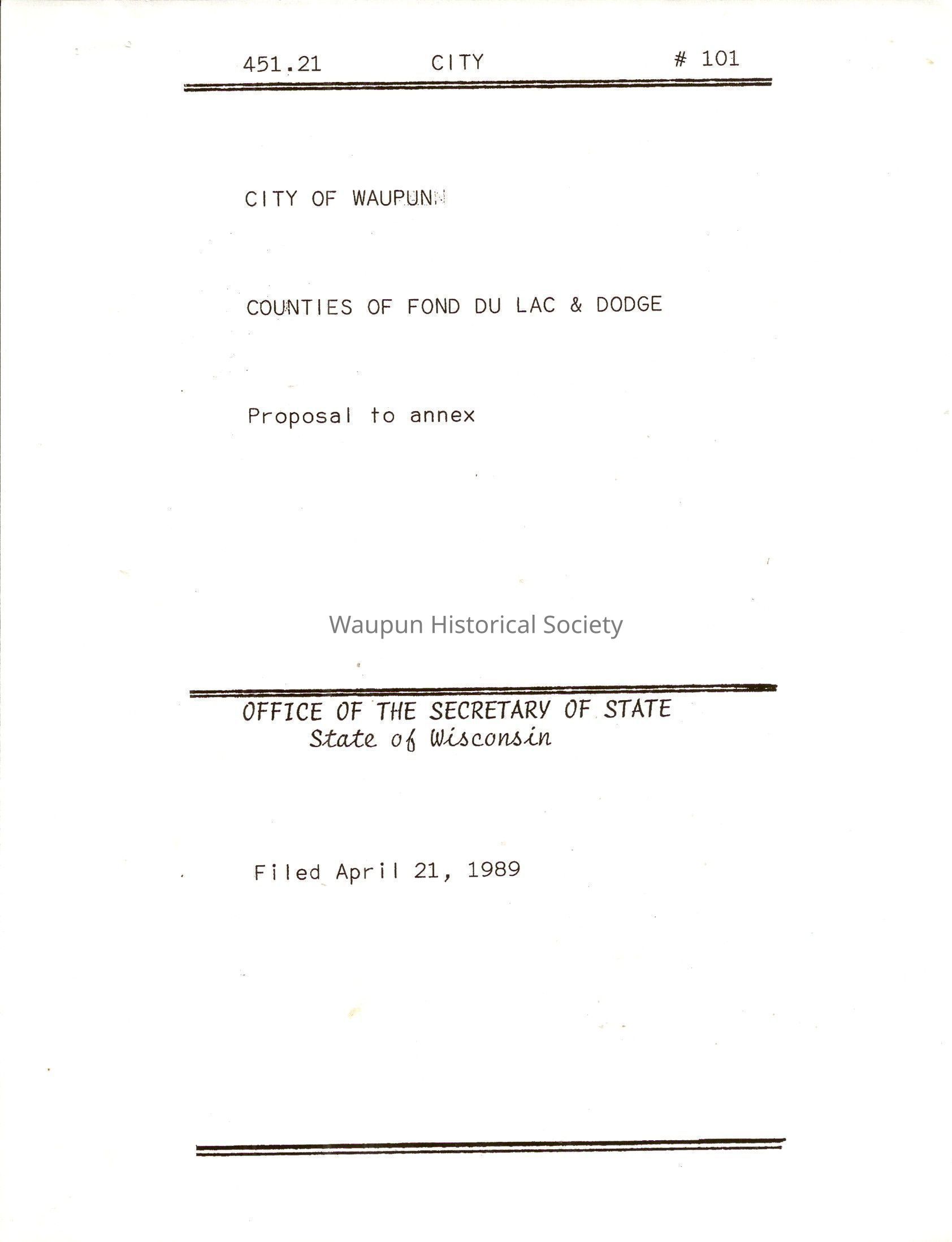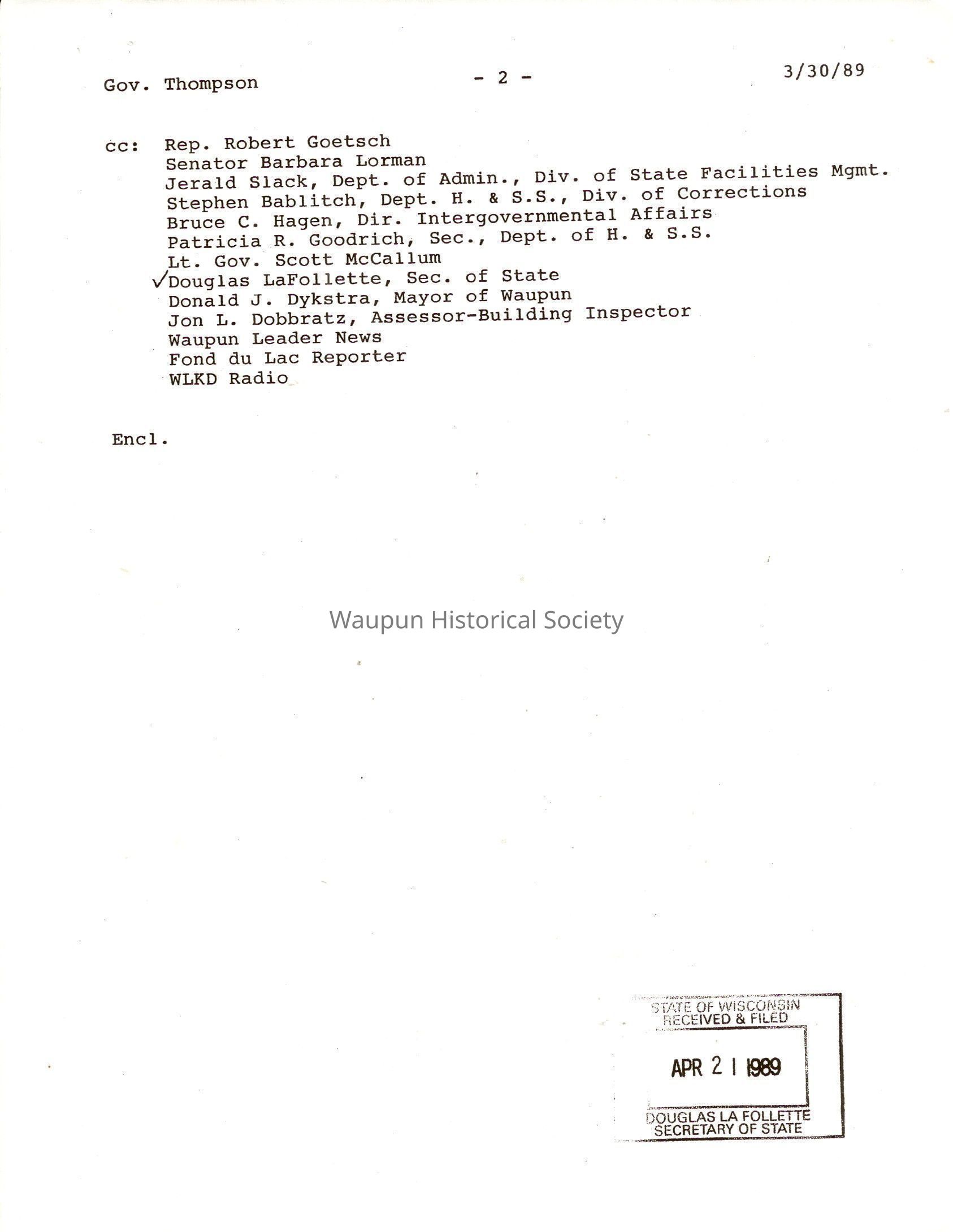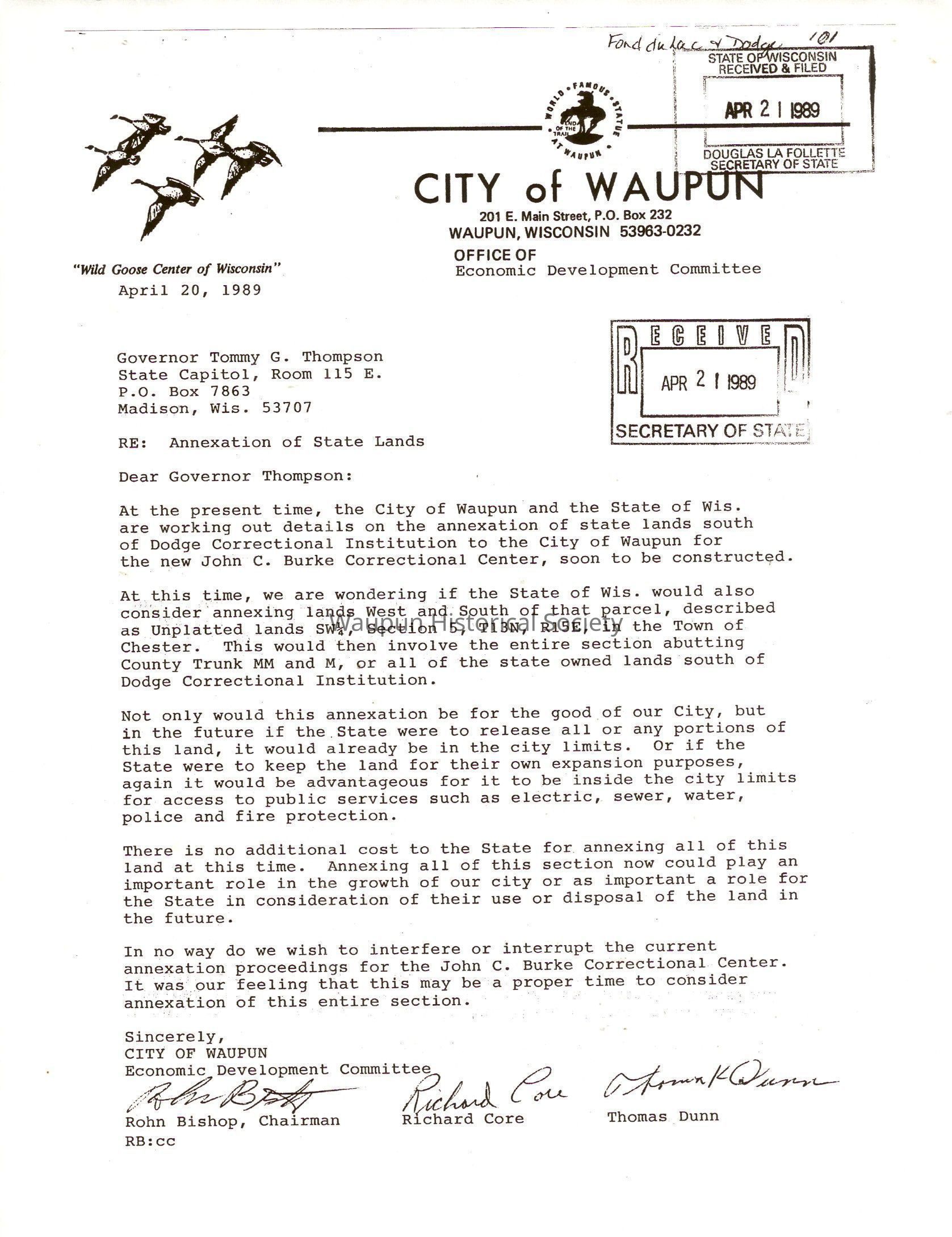 Four page letter of annexation sent to Wisconsin Governor, Tommy G. Thompson from the Waupun Economic Developement Committee.