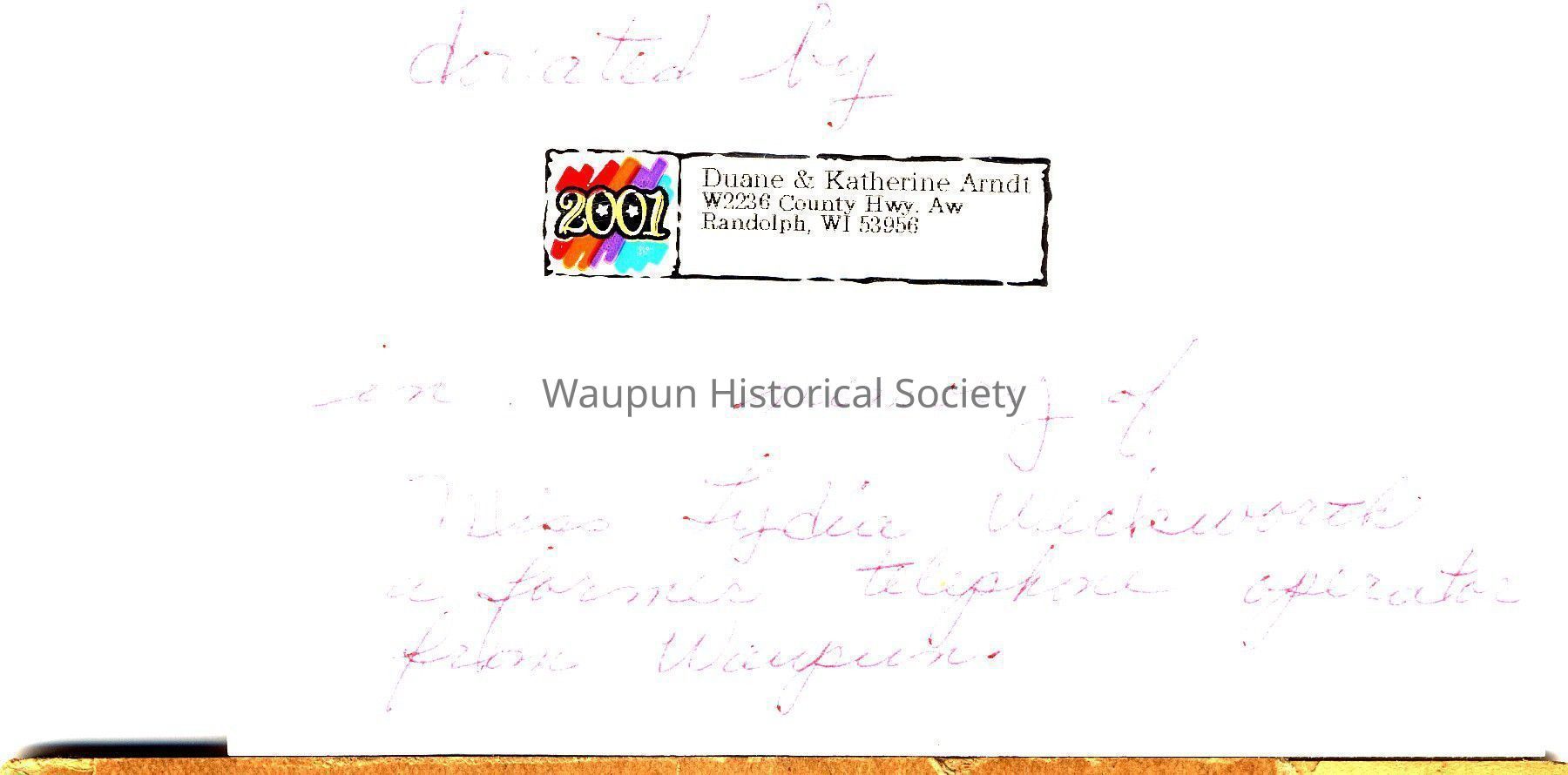 September1920 Waupun Telephone Directory donated in memory of Miss Lydia Weckworth a former telephone operator from Waupun.