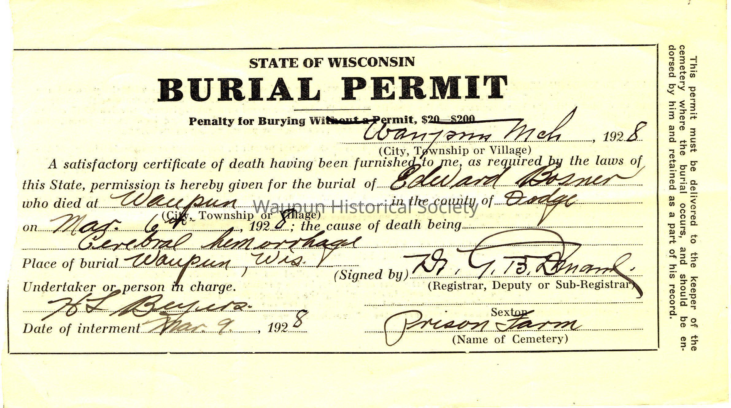 State of Wisconsin Burial Permit for Edward Bosner, who died at Waupun, County of Dodge, Wisconsin, March 6, 1928. Cause of death Cerebral Hemorrhage. Place of burial: Waupun Prison Farm. Signed by Dr. G. B. Durand. Undertaker or person in charge: H. L. Beyers. Date of interment: March 9, 1928.
