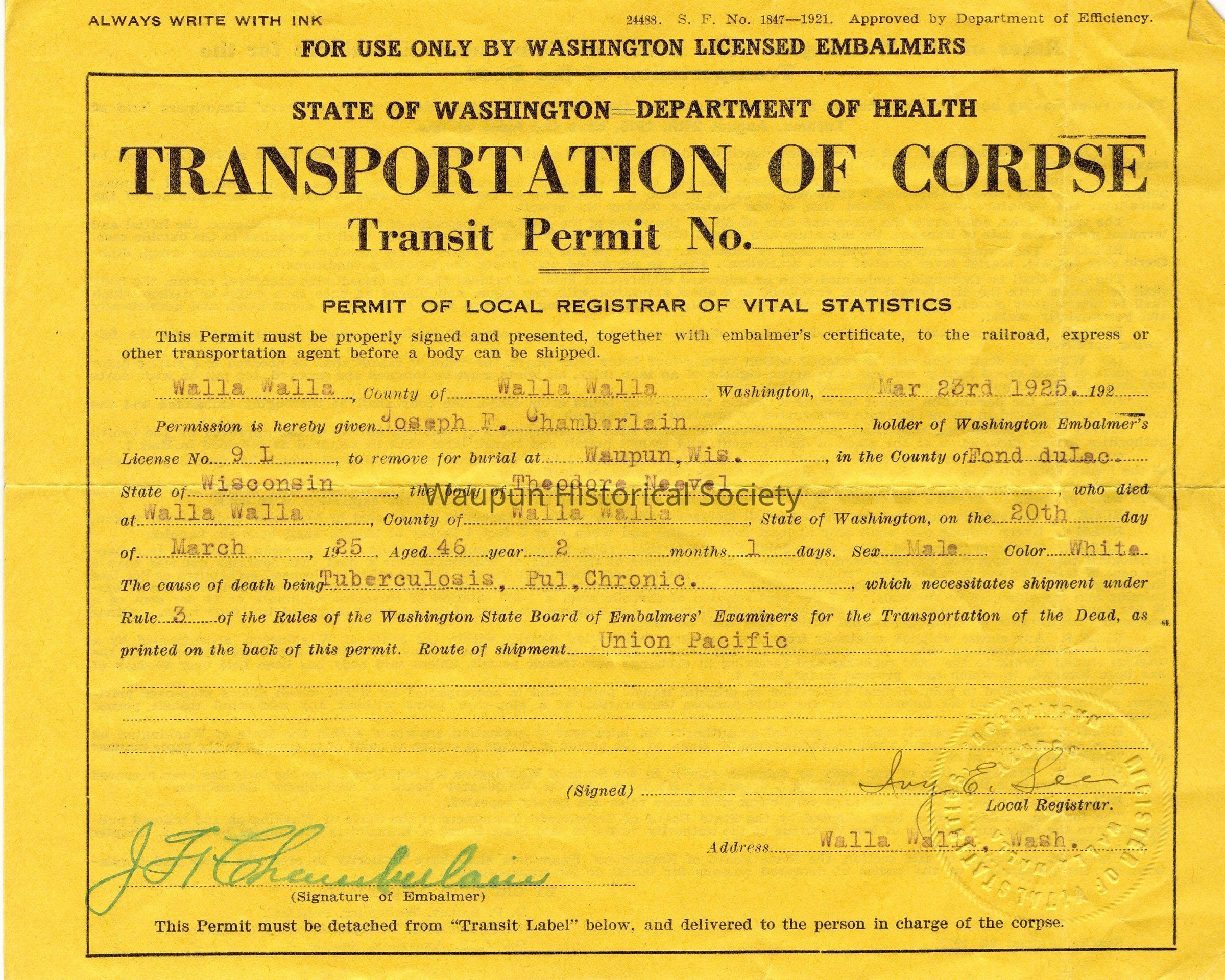 State of Washington Transportation of a Corpse Permit. Walla Walla, County of Walla Walla, Washington, March 23rd, 1925. Permission is hereby given to Joseph F. Chamberlain, holder of Washington Embalmer's License No. 9 L, to remove for burial at Waupun, Wis., in the County of Fond du Lac, State of Wisconsin, the body of Theodore Neevel, who died at Walla Walla, on the 20th day of March, 1925, aged 46 years 2 months, 1 day. Male, White. Cause of death: Tuberculosis, Pulmonary Chronic. Route of shipment: Union Pacific. Signed Ivy E. See. Signature of embalmer: J.F. Chamberlain.