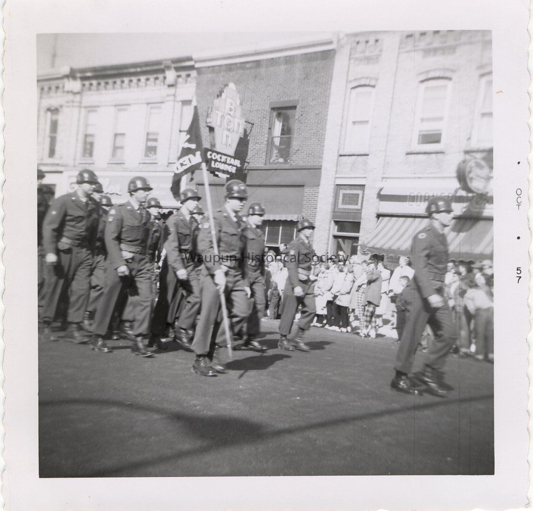 Parade Photos on Main Street Waupun. Dated October 1957. This photo is one of 20 some photos given to the Waupun Historical Society on April 9 2001, by the Fairwater Historical Society. The parade is not identified.Acquisition