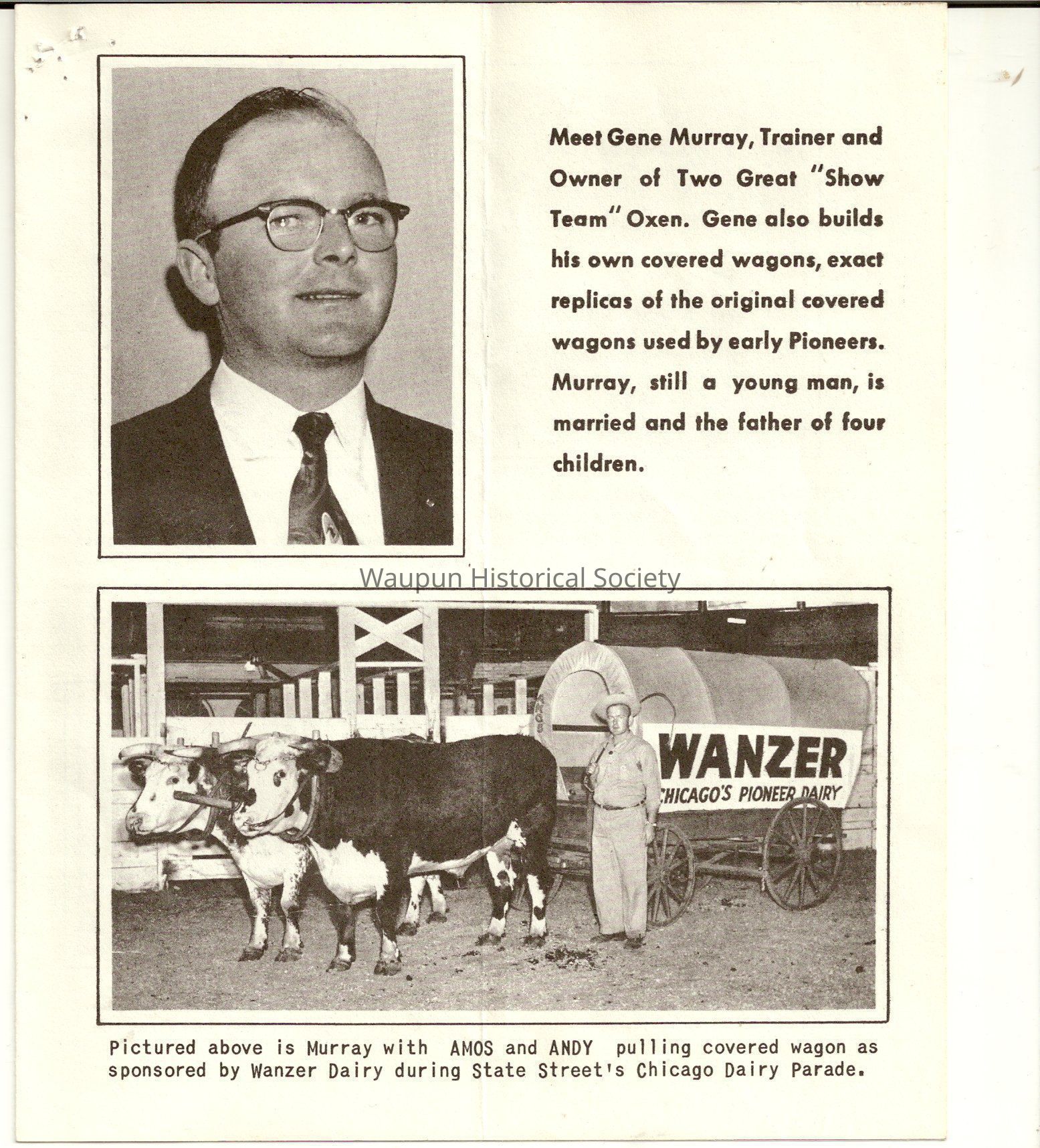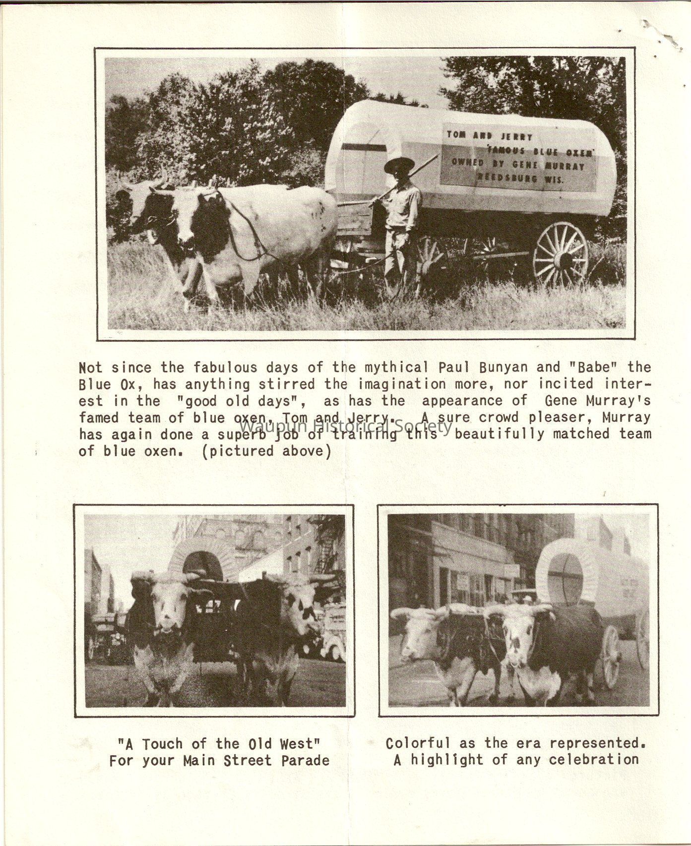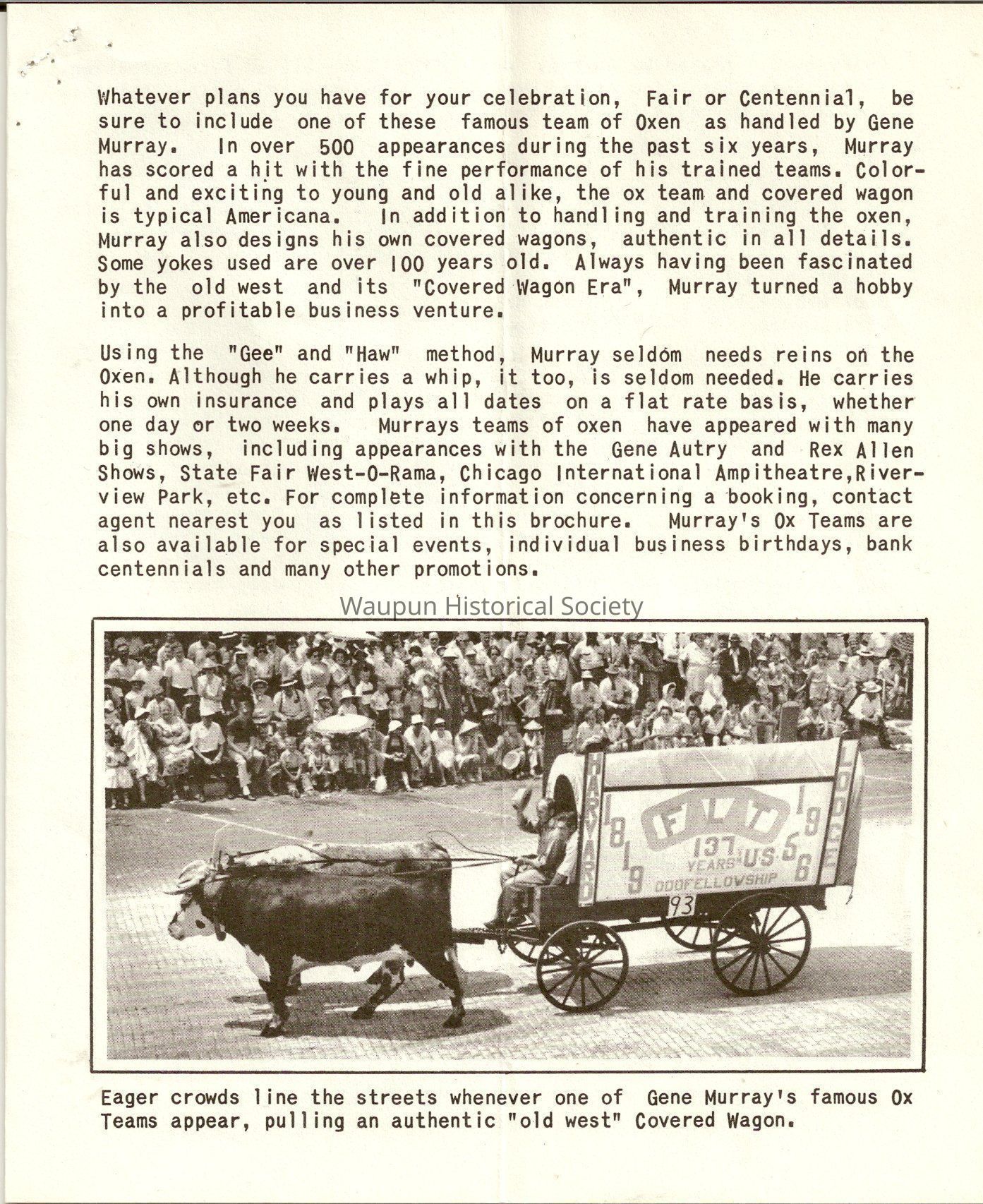 A Brochure of Gene Murray trainer and Owner of two Great show of team Oxen and also build his own cover wagons have always been fascinated by the Old West turn a hobby into a profitable business venture.Acquisition