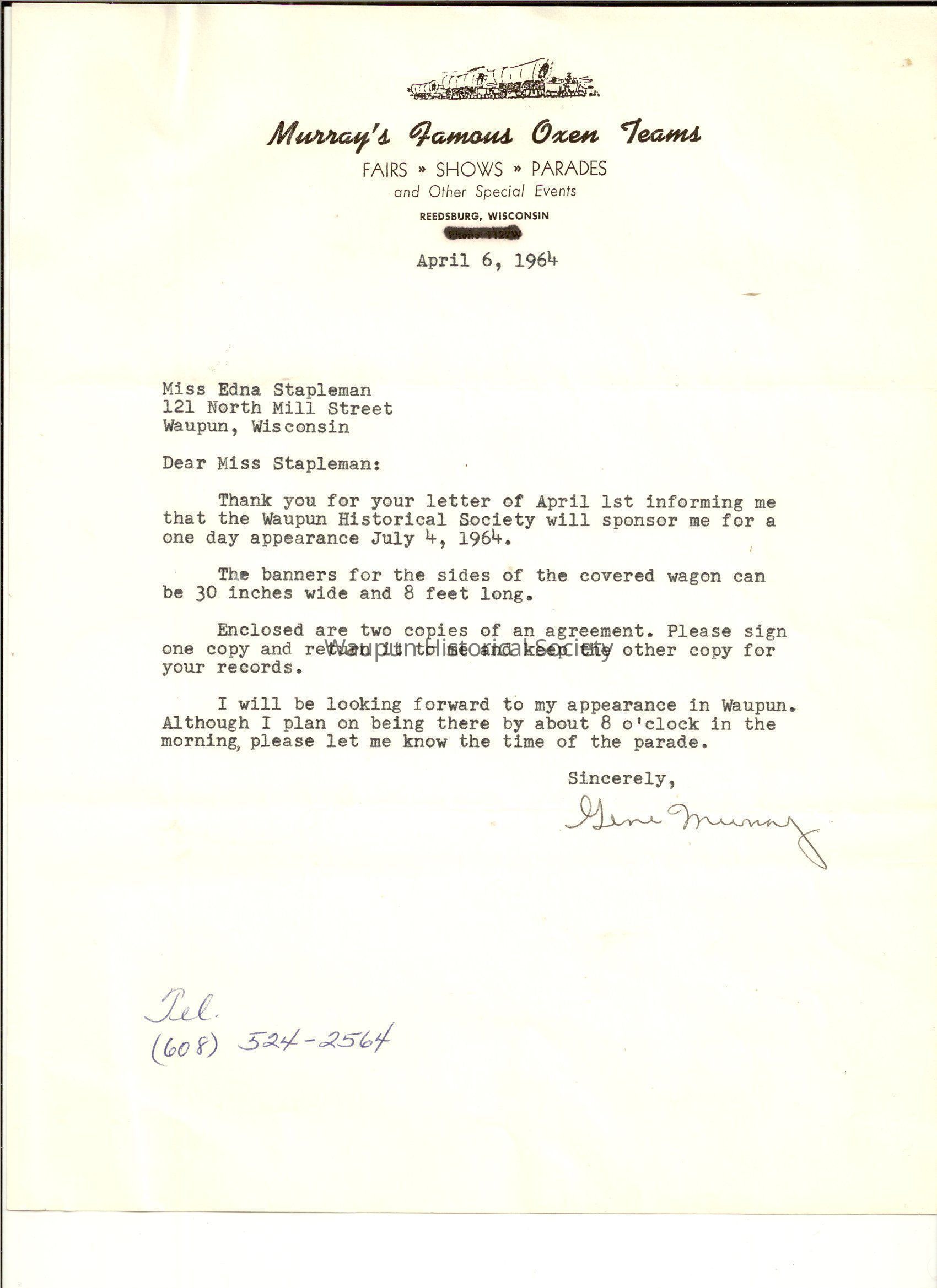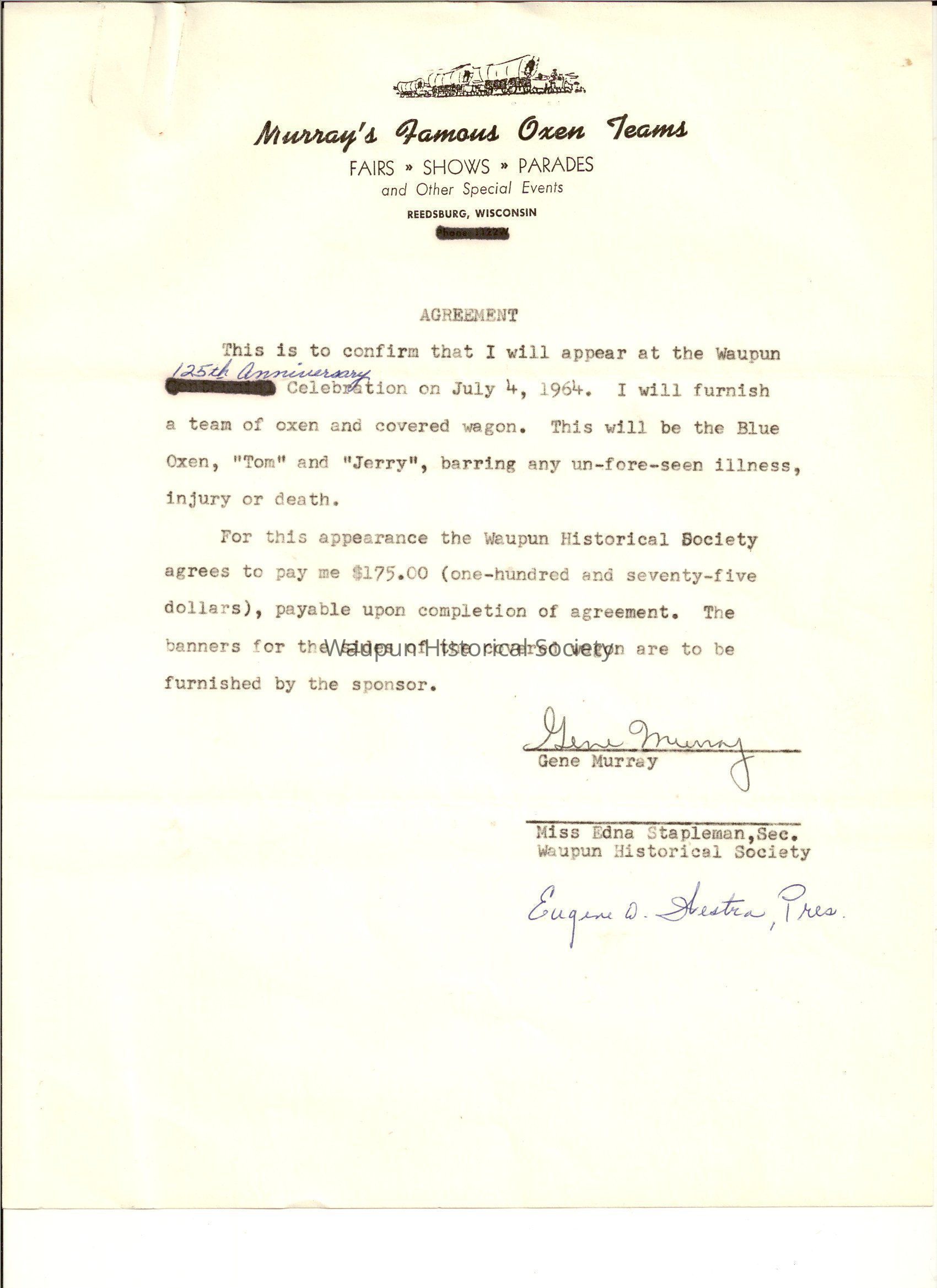 A documents this to confirm that they will appears in Waupun for the 125th anniverary celebration on July 4, 1964 he furnish a team of Oxen and covered wagon and Price list and thank you letter.Acquisition
