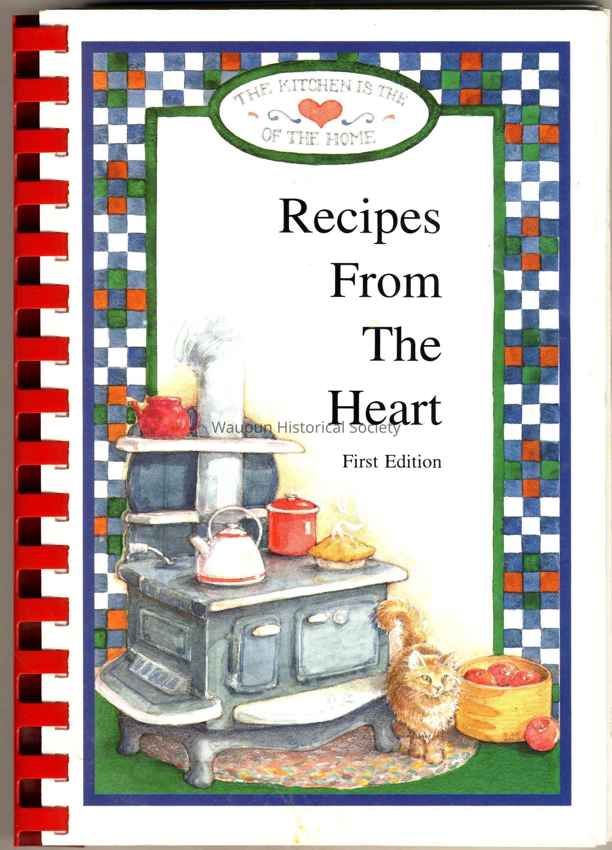 Cook book entitled, "THE KITCHEN IS THE HEART OF THE HOME", Recipes From The Heart, First Edition put together by the FAITH BIBLE CHURCH, 200 Fox Lake Road, Waupun, Wisonsin 53963, Pastor Donald Younger. It is bound with a big red plastic spiral, and a picture of a kitchen stove with a pie and pots and a tea kettle on it. There is also a calico cat standing next to the stove and a basket of red apples. The book has 148 pages.