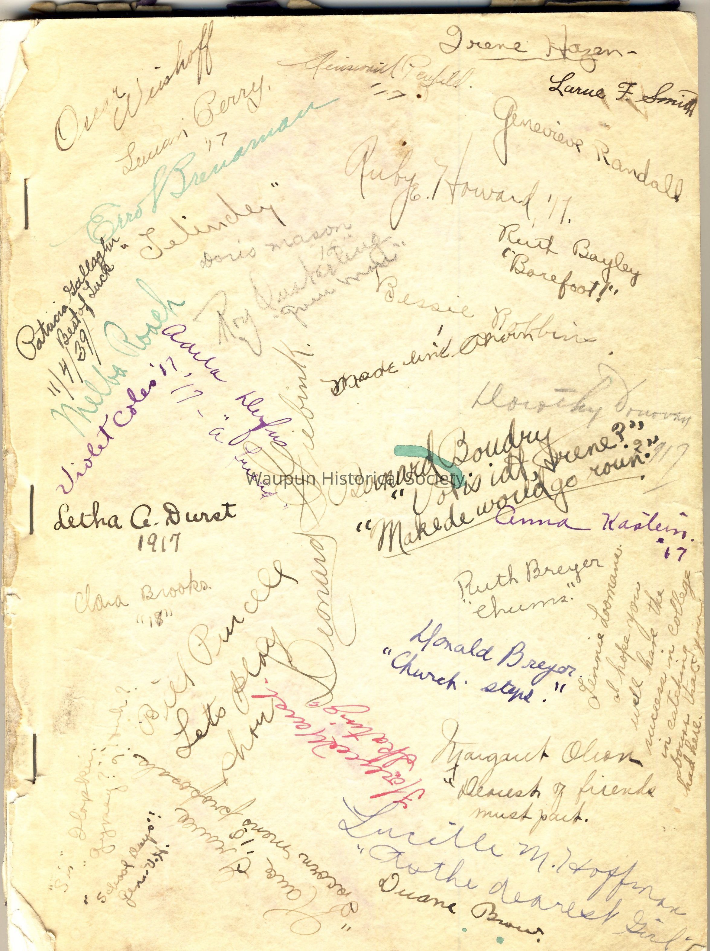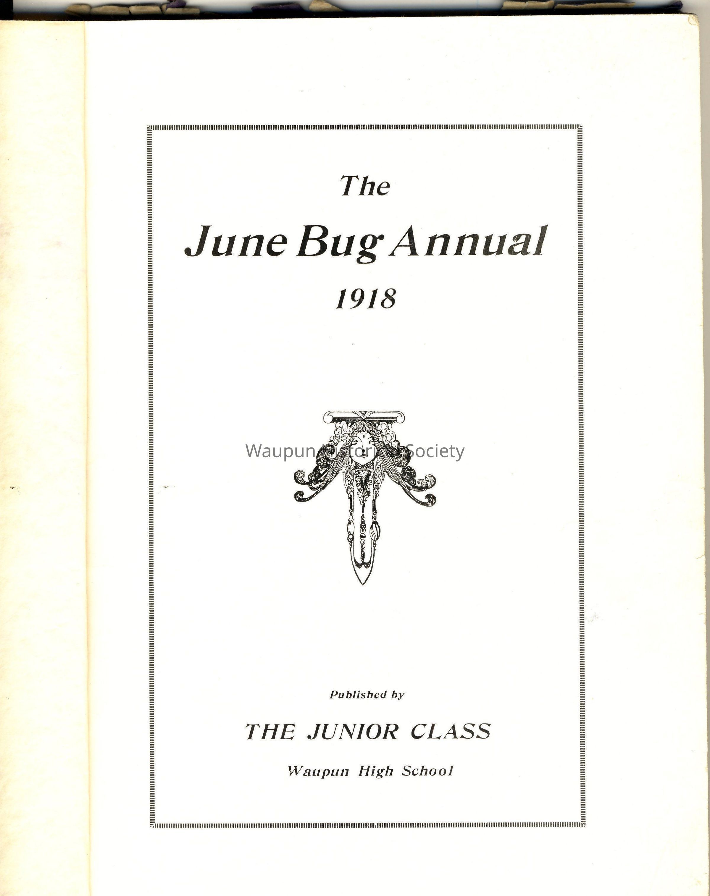 1918 Waupun High School Yearbook - "The June Bug Annual 1918" donated by Virginia Fellman of Fond du Lac. This is actually the graduating class of 1917, but the Junior Class of 1917 published it as they would be the 1918 graduating class. The front paper cover is missing. The book is held together with 3 large staples.Acquisition