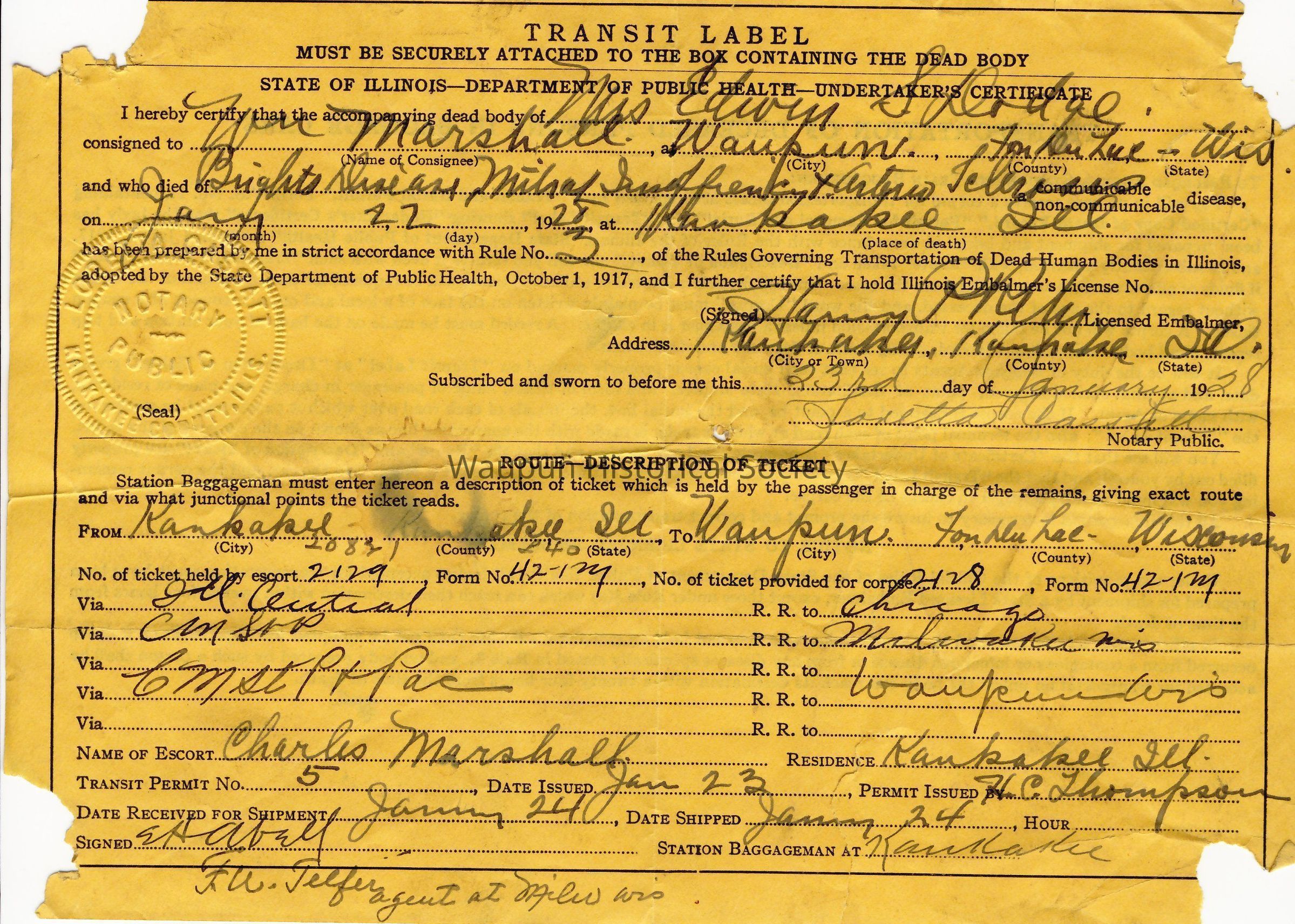 Transit Label: Must be securely attached to the box containing the dead body, State of Illinois Department of Public Health--Undertaker's Certificate. "I hereby certify that the accompanying dead body of Mrs. Edwin S. Dodge, consigned to Wm. Marshall, Waupun, Fond du Lac County, Wisconsin, and who died of Brights Disease, mitrial insufficiency and arterio sclerosis, a non-communicable disease, on January 22, 1928, at Kankakee, Illinois, has been prepared by Harry P. Rehr, licensed embalmer. Signed by the Notary Public Loretta Cassatt. Railroad route from Kankakee to Waupun: Illinois Central to Chicago, C&M and St. Paul to Milwaukee, Wis., C&M St Paul & Pac Railroad to Waupun, Wisconsin. Name of escort: Charles Marshall, Kankakee, Ill. Permit issued by H. C. Thompson. Signed by baggagemen: E. H. Abell, Kankakee, and F. W. Telfer, Milwaukee.