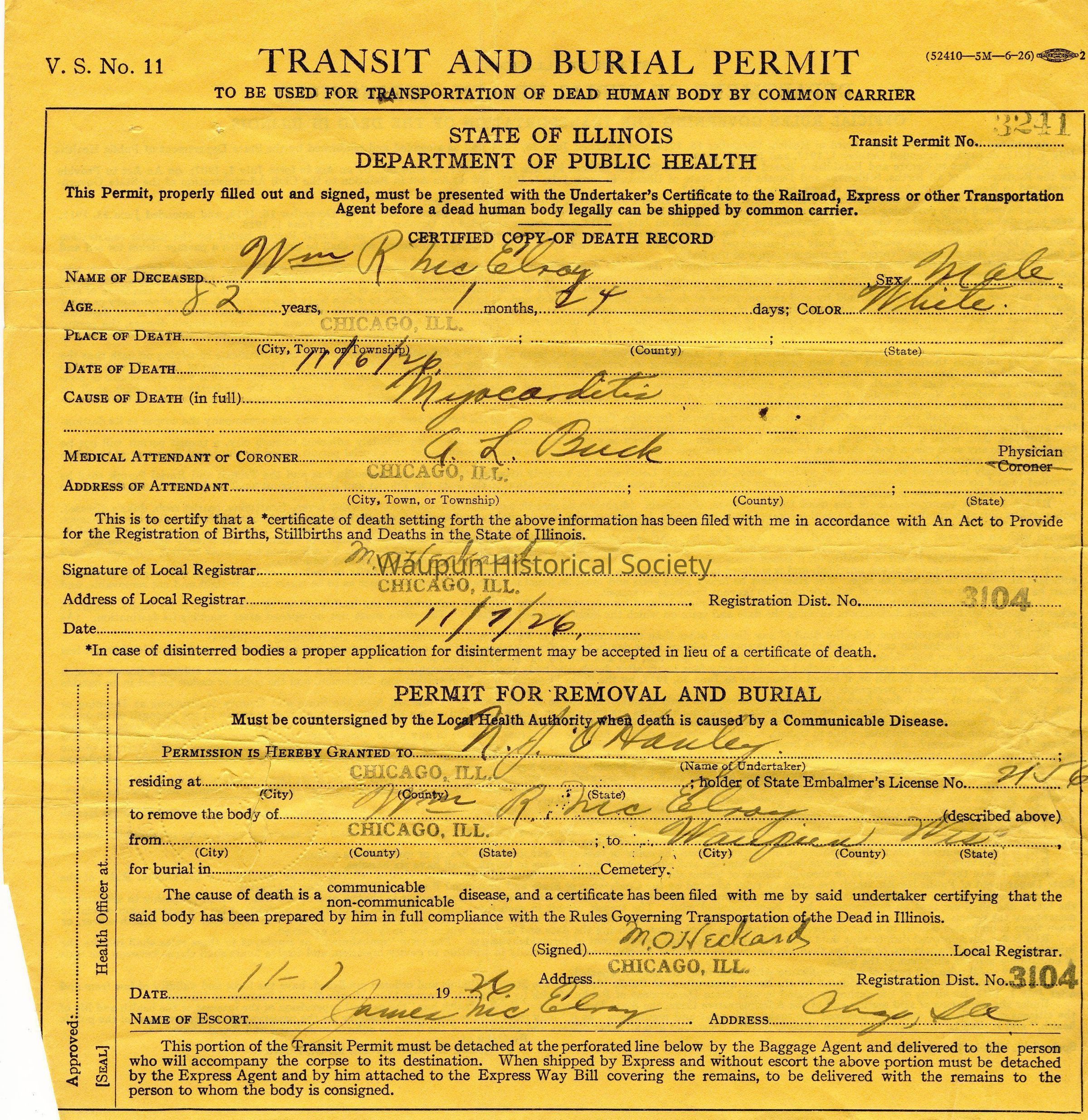Transit and Burial Permit State of Illinois Department of Public Health. Name of deceased: Wm. R. Mc Elroy. Male, age 82 years, 1 month, 24 days. White. Place of death: Chicago, Illinois. Date of death: November 6, 1926. Cause of death: Myocarditis. Medical attendant: G. L. Buck, Physician. N. J. O'Hanley, undertaker, had permission to remove the body of Mr. McElroy to Waupun. Name of Escort: James McElroy, Chicago, Illinois.