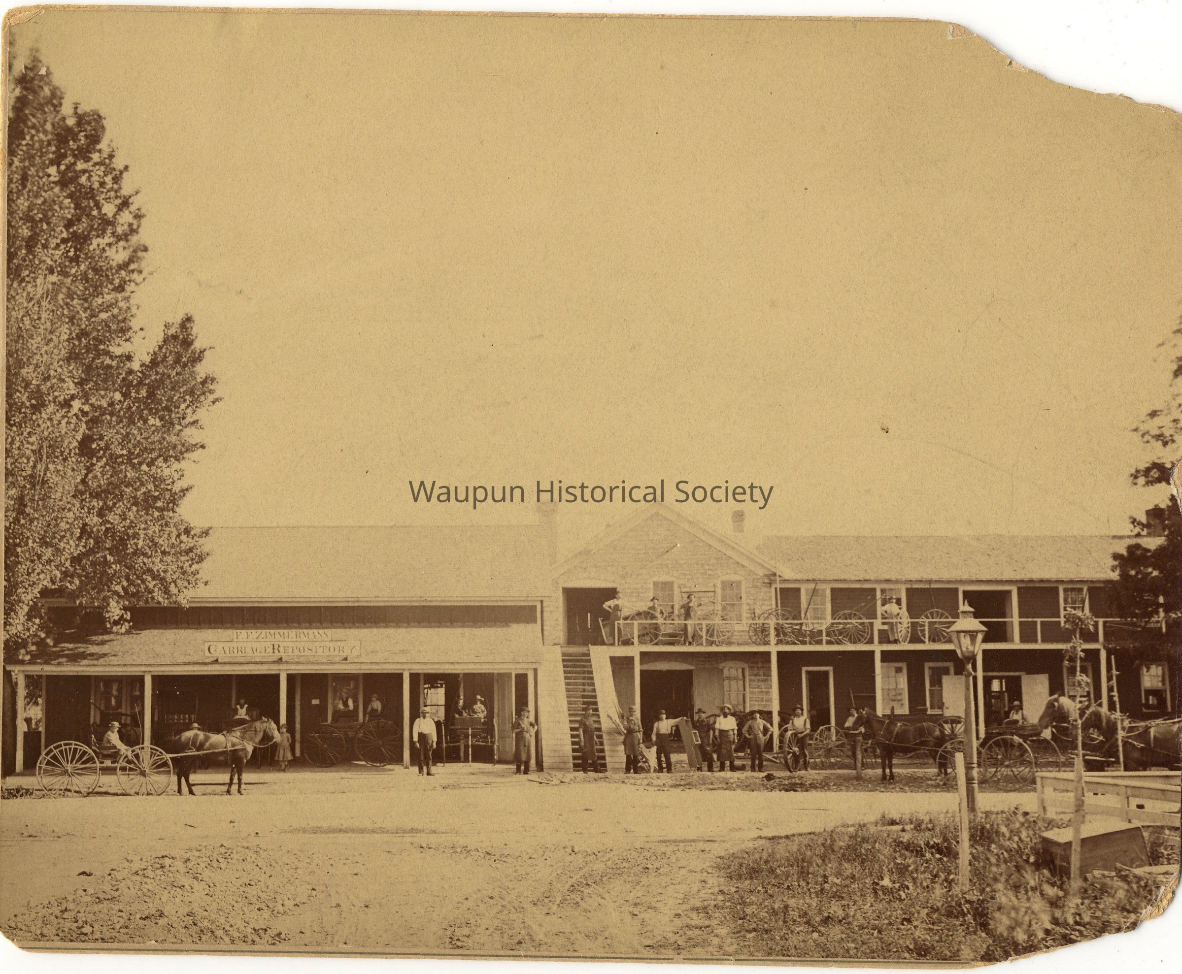 Original photograph found with early hotels of Waupun. There is no identifying information claiming this is a hotel. Date on the photograph is April 21st, 1889. What is read is "F. F. Zimmermann Carriage Repository." No donation name or date given.