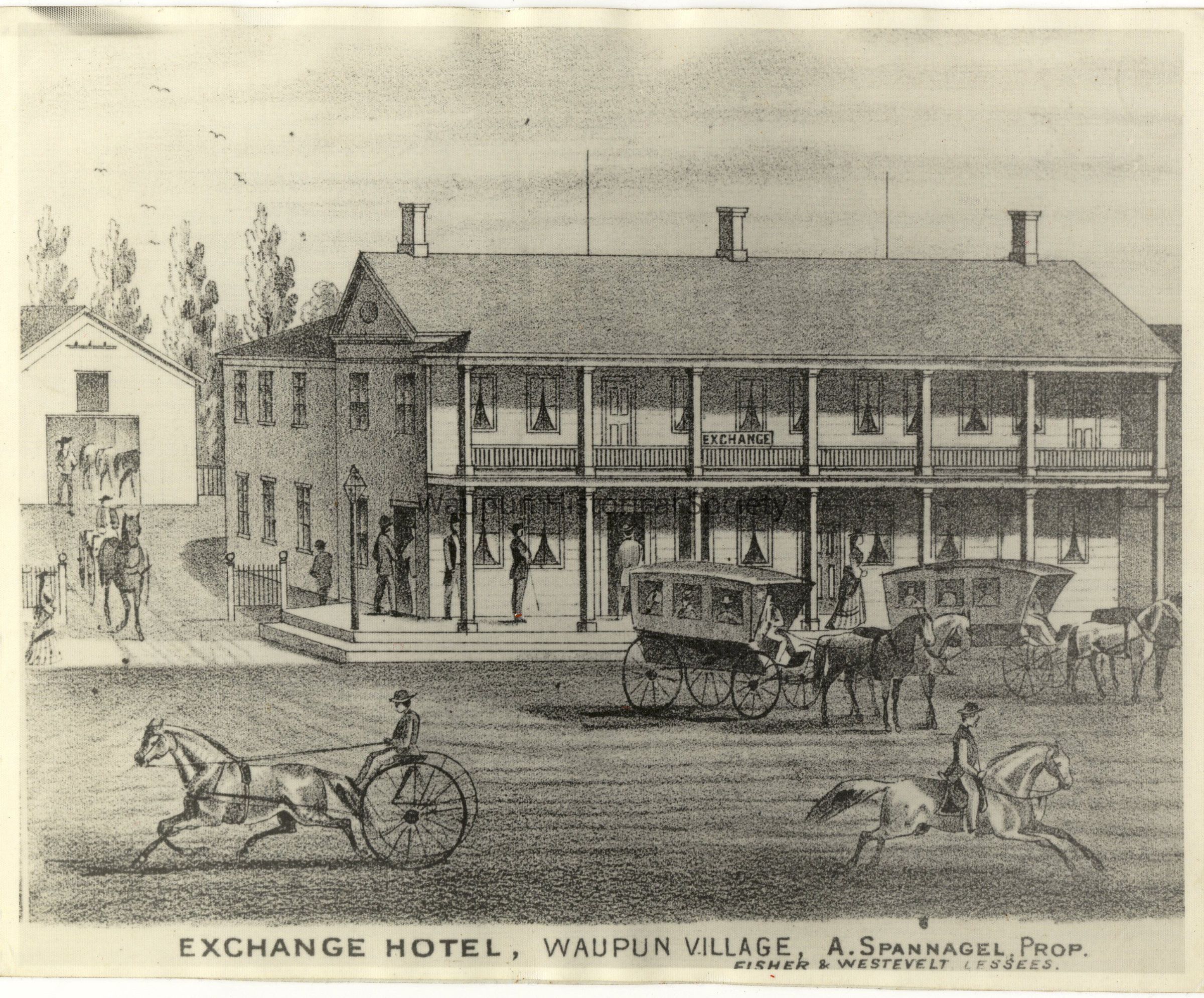 Exchange Hotel, Waupun Village, August Spannagel, Prop. Fisher & Westevelt, Lessees. Drawing of the Exchange Hotel, from about 1863. Located at Washington and Fond du Lac Roads. The Museum collection has two of these pictures. On the back of the second is a complete early history, complete with genealogical information, regarding the Wilcox family. It is handwritten, and at this time, anonymous. "The Exchange Hotel--This was built by Seymour Wilcox in 1844. The name of the Hotel in 1844 was "The Old Stand." It was the second home of Seymour and his wife Lucy and their seven children. Thurston and Hermon, both born in Vergemres, Addison Co., Vermont, Mary Caroline (Wilcox) Brooks and George Silvias (Judd) were born in or near Clarkstown, Ontario, Canada, Emily Janet (WIlcox) Houghton born in Little Suamico, Wis., Nelson Newton born in DePere, Brown County, Wis., Ira Jason (1st white boy born in Waupun) all lived here until their new home, the 1st frame house was built in 1846. This house faced North Madison St. was about two or three lots north of the corner of Jackson St and at that time it was only a field. Seymour and Lucy had two more children after they moved into their 3rd home (and their last home). The two children were Thomas and Harriet. These two died very young and were buried in the "Old Cemetery" (now 1970) Wilcox Park, at corner of Watertown and Lincoln St. Their remains were never removed. Seymour died in the 1st frame house (built 1846) Jan. 17, 1879, had he lived until Jan 25th of the same year he and Lucy would have celebrated their Golden Wedding. THis house was burned down 1895 by their young grandson, April, 1895, Earl Newton Wilcox, age 7 yrs. was playing with matches, started a leaf fire under the back porch. The Nelson Newton Wilcox family was living in the old home caring for "Grandma Lucy" who was bedridden at the time of the fire, she was taken to the home of her daughter, Emily J. Houghton who then lived at the corner of No. Madison and Jackson St. in the small brick home still standing (1970) and now being used as a dentist office, owned by James J. Hendrick Dentist. At this home Lucy ((Newton) Wilcox passed away August 27, 1895. Both Seymour and Lucy (Newton) Wilcox are buried in Forest Mound Cemetery, Waupun, Fond du Lac Co., Wis. on their son's (Ira Wilcox) lot. Lucy (Newton) Wilcox was the daughter of Jason & Amy (Gage) Newton, Amy Gage was the daughter of George and M. (Dupper) Gage. George Gage was a Revolutionary soldier, as was his father William. Capt. William Gage. Capt. William's wife was Mercy Huddleton." Written in 1970 by UNKNOWN (perhaps someone whose great-aunt was the wife of Ira Jason Wilcox, Angeline Midaugh Wilcox.