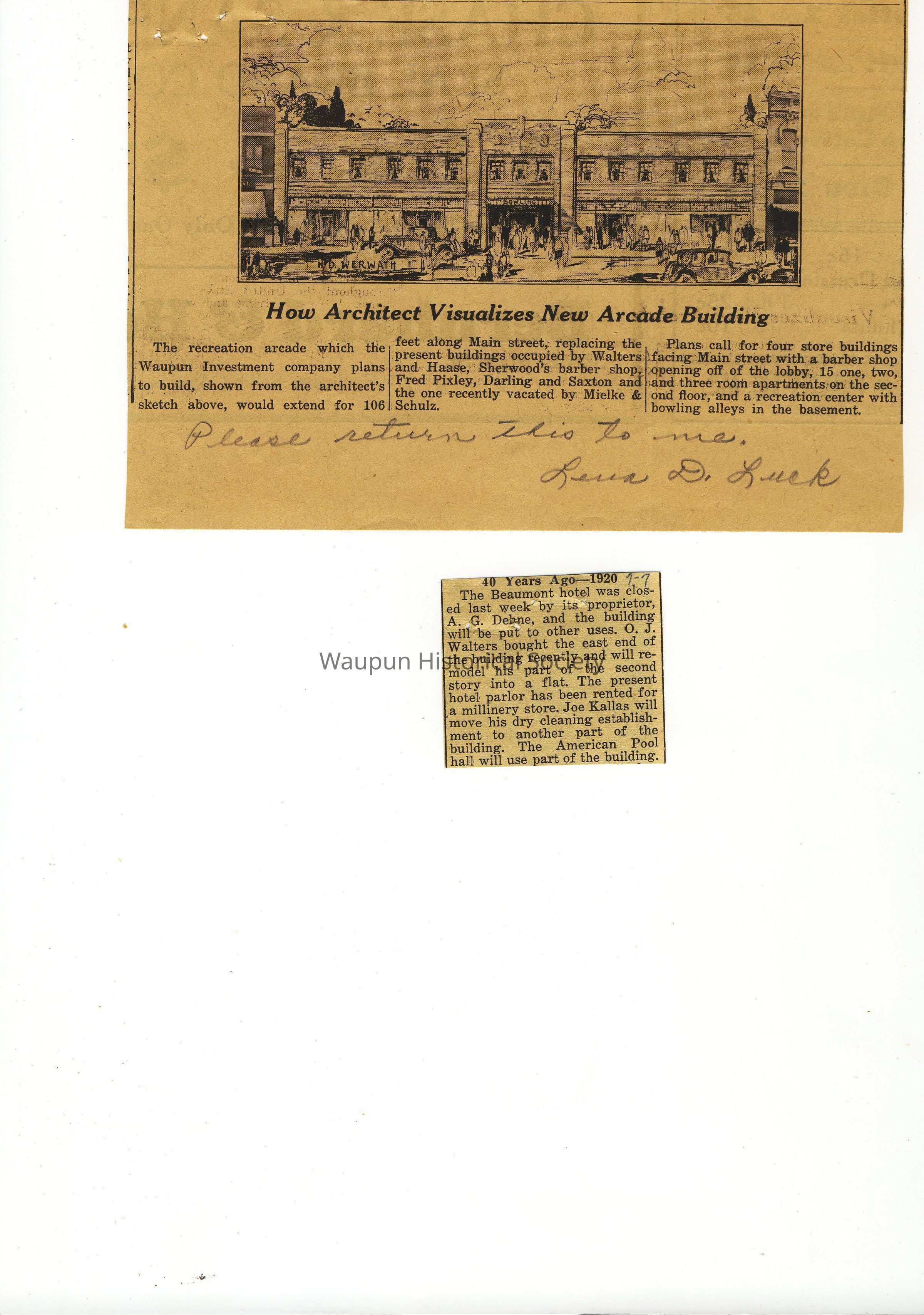 Two small newspaper clippings, one from July 7, 1960: 40 Years Ago--1920--The Beaumont Hotel was closed last week by its proprietor, A. G. Dehne, and the building will be put to other uses. O. J. Walters bought the east end of the building recently and will remodel his part of the second story into a flat. The present hotel parlor has been rented for a millinery store. Joe Kallas will move his dry cleaning establishment to another part of the building. The American Pool hall will use part of the building. The second clipping: How Architect visualizes new arcade building. The recreation arcade which the Waupun Investment company plans to build, shown from the architect's sketch above, would extend for 106 feet along Main Street, replacing the present buildings occupied by Walters and Haase, Sherwood's barber shop, Fred Pixley, Darling and Saxton and the one recently vacated by Mielke & Schulz. Plans call for four store buildings facing Main street with a barber shop opening off of the lobby, 15 one, two and three room apartments on the second floor, and a recreation center with bowling alleys in the basement. Submitted by Lena D. Luck (who wanted them returned!). No date, except on the back reads "In place of our CIty Hotel--now 1929." May indeed be from 1929: The automobiles in the picture are of that vintage.