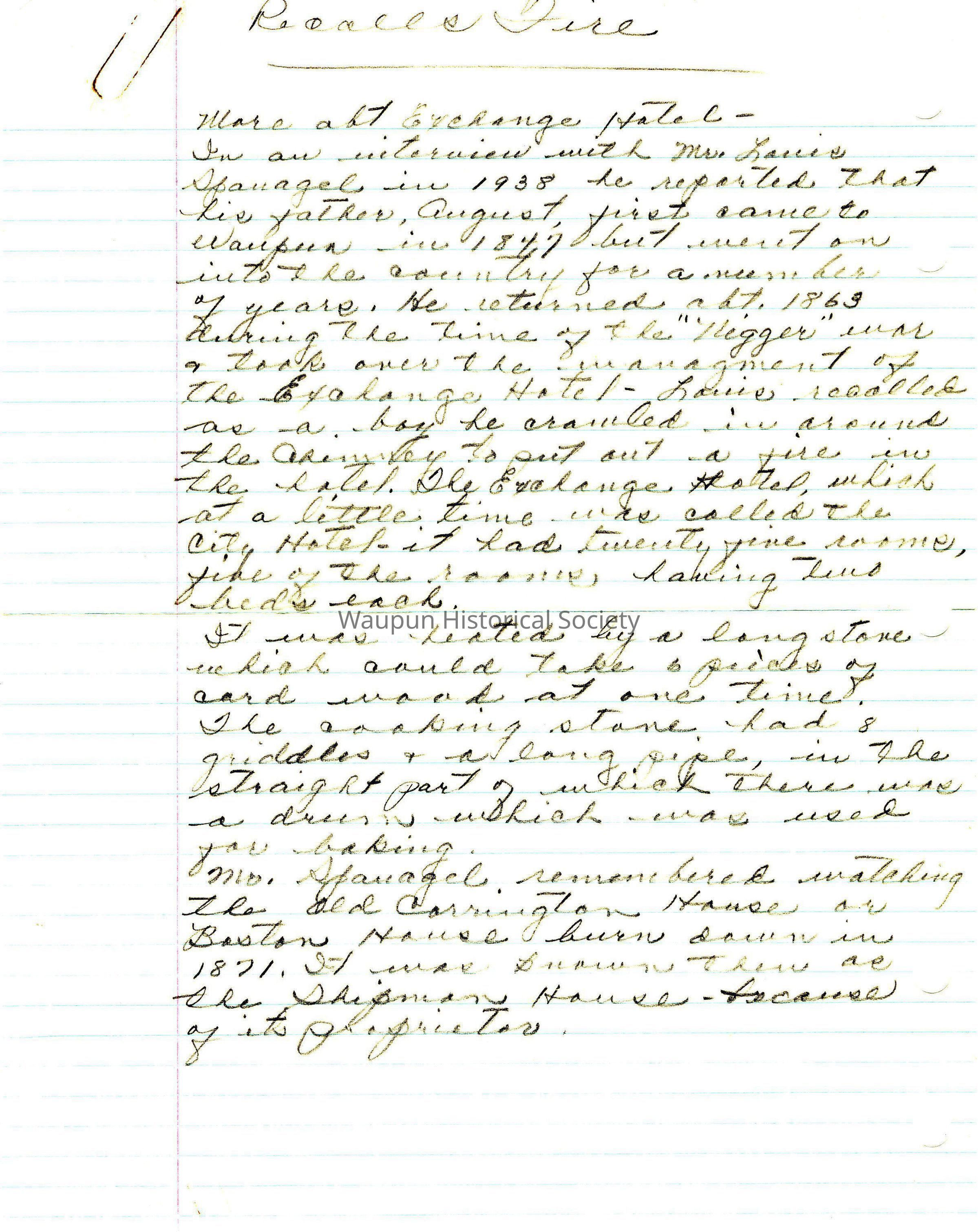 Recalls Fire. More about Exchange Hotel. In an interview with Mr. Louis Spanagel in 1938 he reported that his father, August, first came to Waupun in 1847 but went on into the country for a number of years. He returned about 1863 during the time of the "Nigger" war and took over the management of the Exchange Hotel. Louis recalled as a boy he crawled in the chimneyy to put out a fire in the hotel. The Exchange Hotel, which at a little time was called the City Hotel, it had twenty-five rooms, five of the rooms having two beds each. It was heated by a long stove which could take 6 pieces of cord wood at one time. The cooking stove had 8 griddles and a long pipe, in the straight part of which there was a drum which was used for baking. Mr. Spanagel remembered watching the old Carrington House or Boston House burn down in 1871. It was known then as the Shipman House because of its proprietors. Probably written down by Lena D. Luck as it was stapled to something else with her name on it.