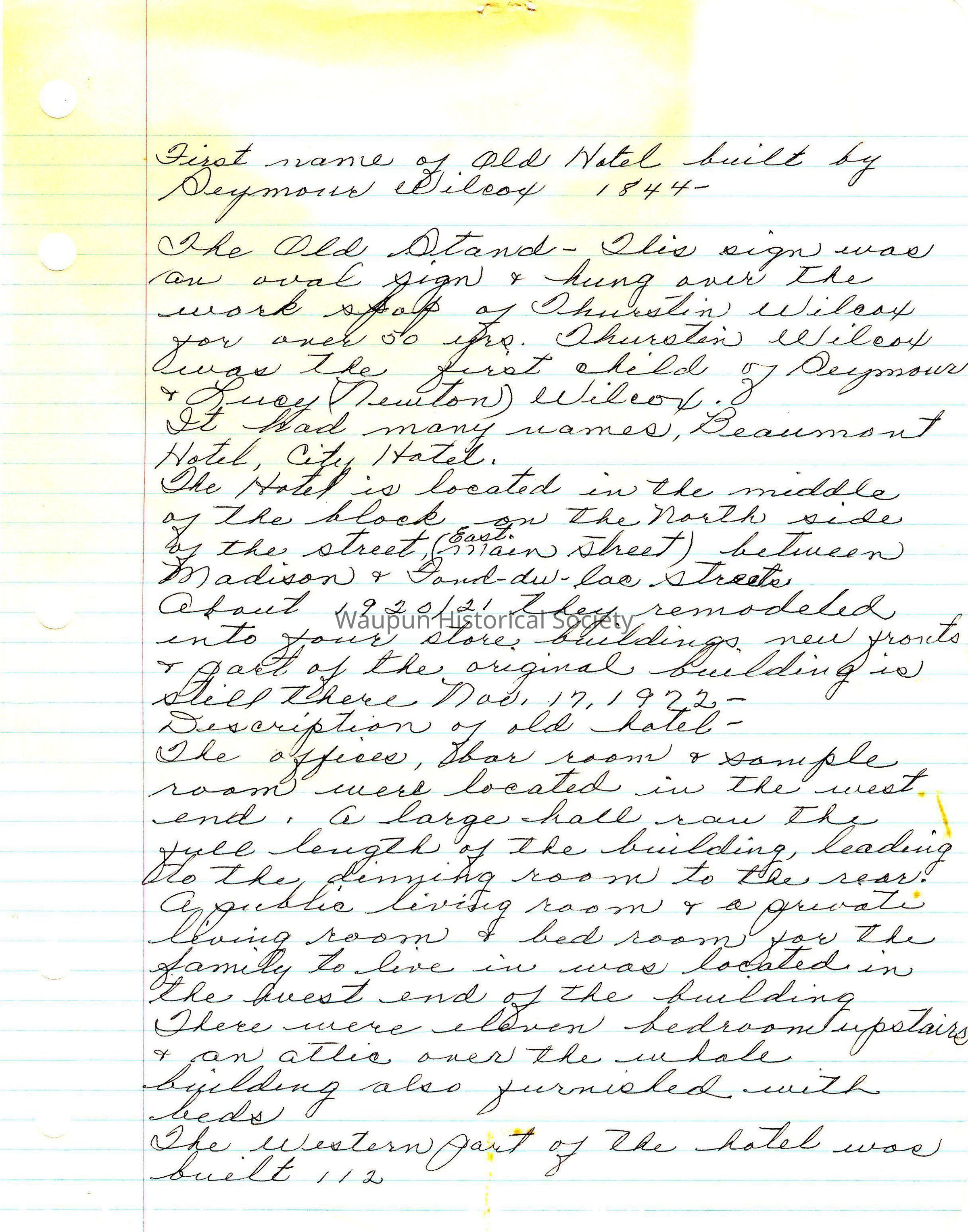 Handwritten Hotel Account. Author unknown...perhaps Martha Gunnison. First name of old hotel built by Seymour Wilcox 1844. The Old Stand. This sign was an oval sign and hung over the workshop of Thurston Wilcox for over 50 years. Thurston Wilcox was the first child of Seymour and Lucy (Newton) Wilcox. It had many names: Beaumont Hotel, City Hotel. The hotel is located in the middle of the block on the north side of the street (East Main Street) between Madison and Fond du Lac streets. About 1920/1 they remodeled into four store buildings, new fronts and part of the original building is still there Nov. 17, 1972. Description of old hotel: The offices, bar room and sample room were located in the west end. A large hall ran the full length of the building, leading to the dining room to the rear. A public living room and a private living room and bedroom for the family to live in was located in the west end of the building. There were eleven bedrooms upstairs and an attic over the whole building also furnished with beds. The bestern part of the hotel was built 112 (presumably years ago). November 17, 1972.