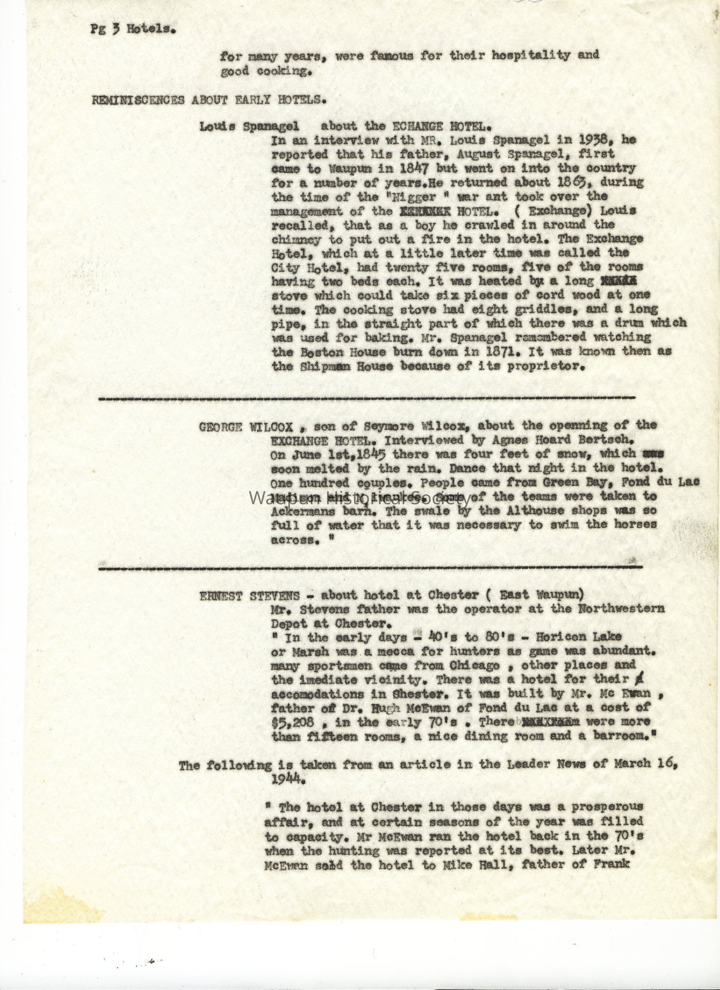 Louis Spanagel about the Exchange Hotel. In an interview with Mr. Louis Spanagel in 1938, he reported that his father, August Spanagel, first came to Waupun in 1847 but went on into the country for a number of years. He returned in 1863, during the time of the "Nigger" war and took over the management of the Exchange Hotel. Louis recalled that as a boy he crawled in around the chimney to put out a fire in the hotel. The Exchange Hotel, which at a little later time was called the City Hotel, had twenty five rooms, five of the rooms having two beds each. It was heated by a long stove which could take six pieces of cord wood at one time. The cooking stove had eight griddles, and a long pipe, in the straight part of whcih there was a drum which was used for baking. Mr. Spanagel remembered watching the Boston House burn down in 1871. It was known then as the Shipman House because of its proprietor.
