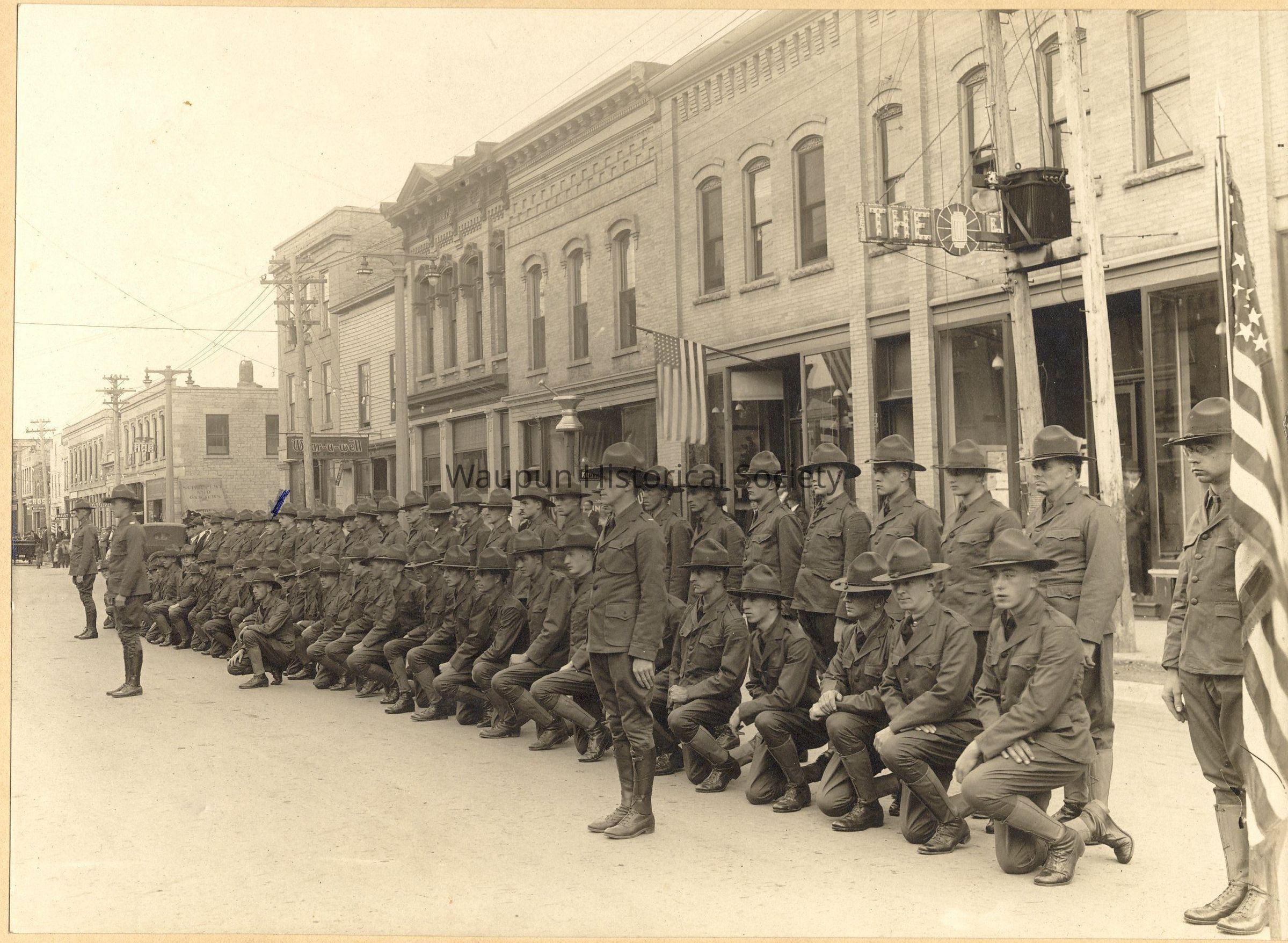 Home Guard 1917 or 1918. Picture of the Home Guard taken on main street. This photo was owned by Mrs. Percy Sherwood, one donated by Vyrna Sherwood Lawrence, and one more of each photo donated by Ardis Yule. Mr. Percy Sherwood is marked on the front of the photo. Store at Left (Where Schultz Bros. was ) was Schuppert & Gysbers.