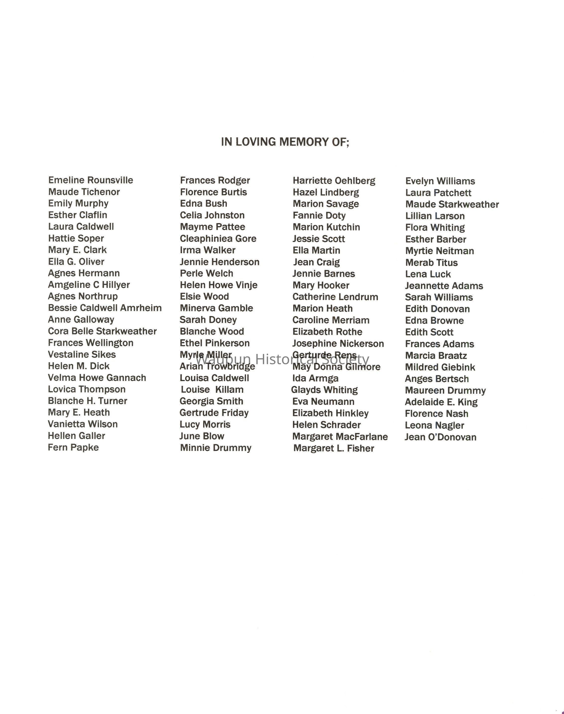 The work these thirteen noble women began in 1902 has been maintained by other equally dedicated members, so that now our society is the oldest women's organization extant in Waupun.