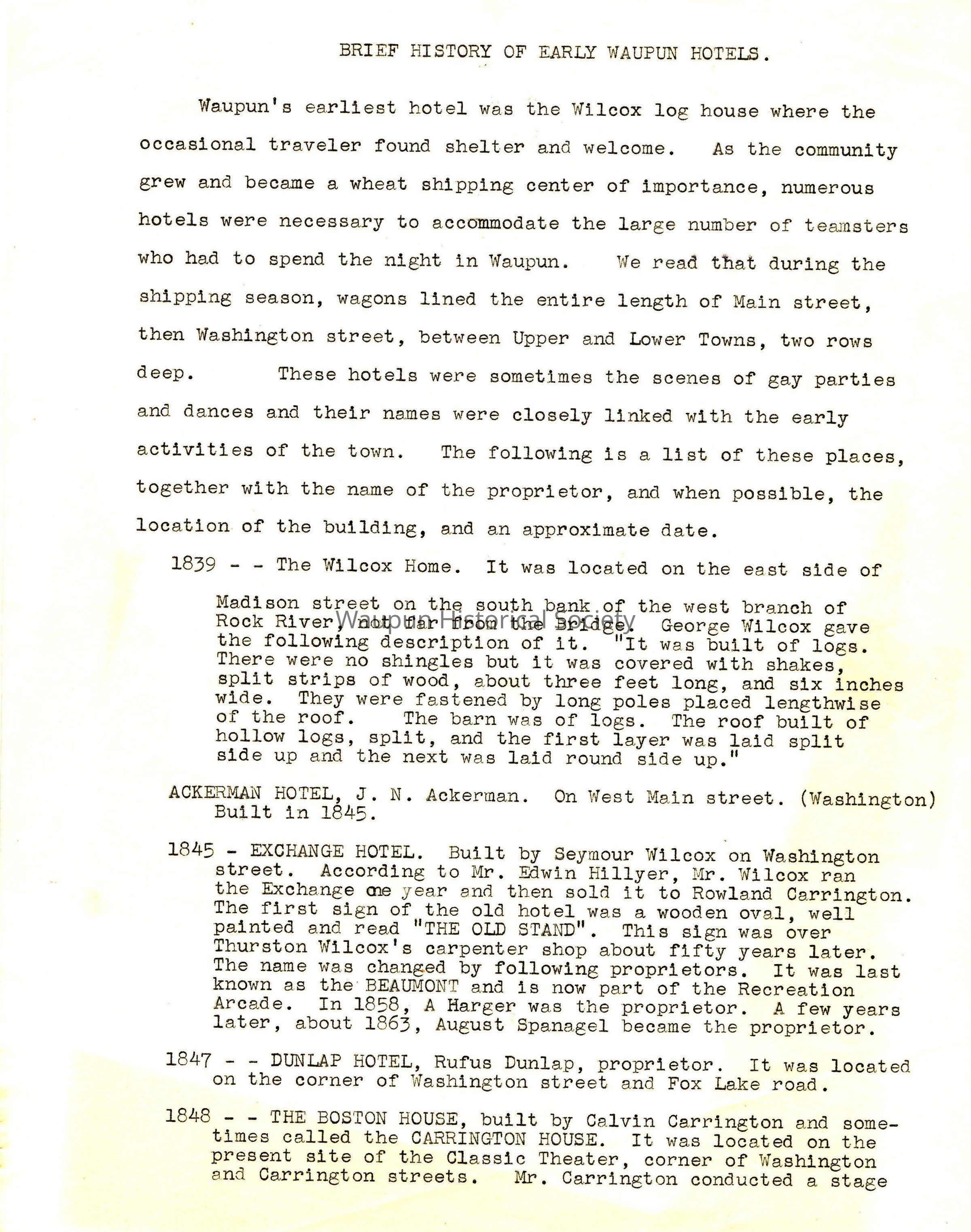 Brief History of Early Waupun Hotels: Prepared by Edith Moul Scott, June 1959. Complete typewritten manuscript, which is exactly the same as what was written from 2005.0015.0013 through 2005.0015.0018.