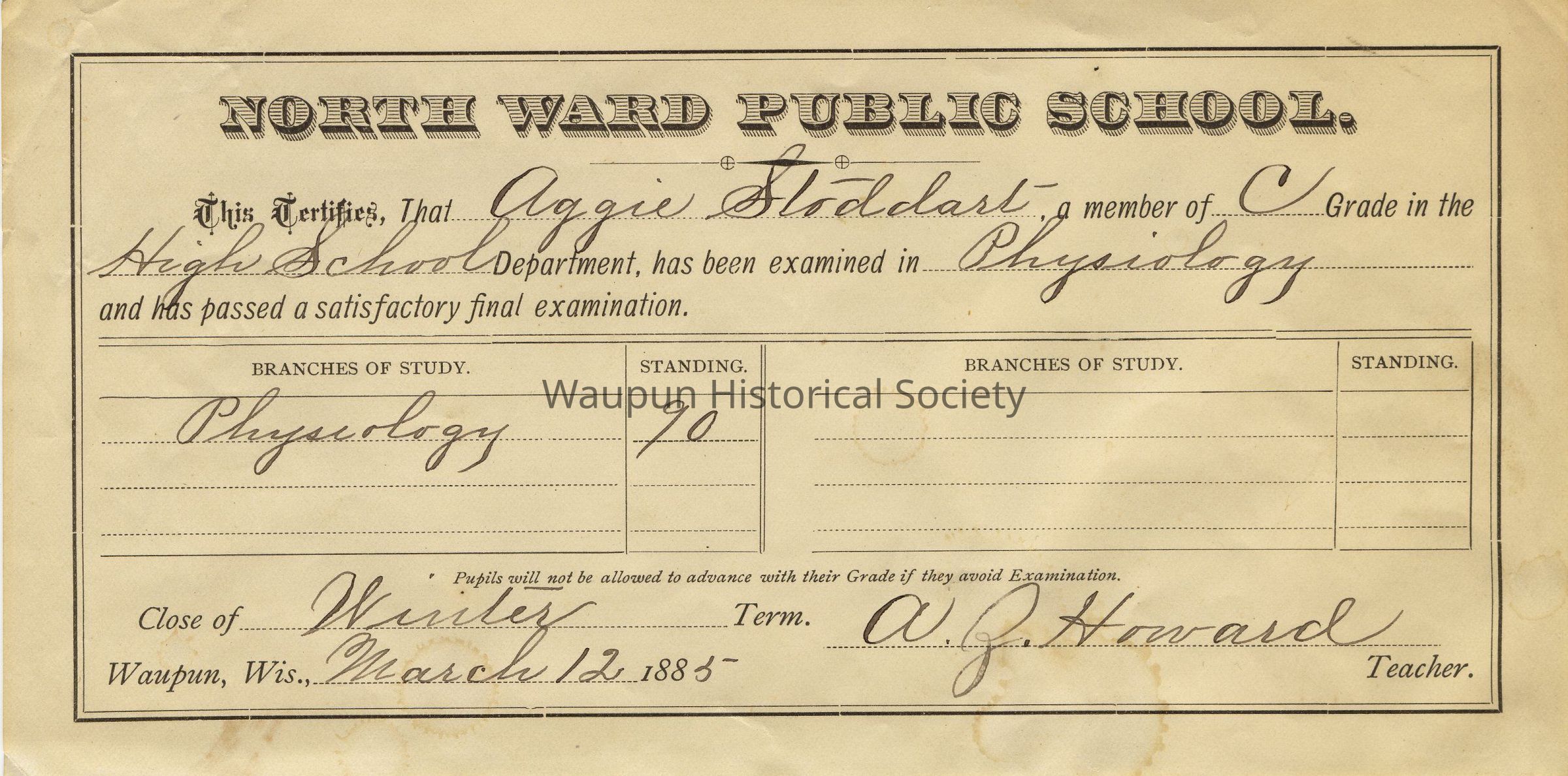 North Ward Public School Report Card. High School Report card for Aggie Stoddart dated March 12, 1885. Given to her by her teacher A.Z. HowardAcquisition