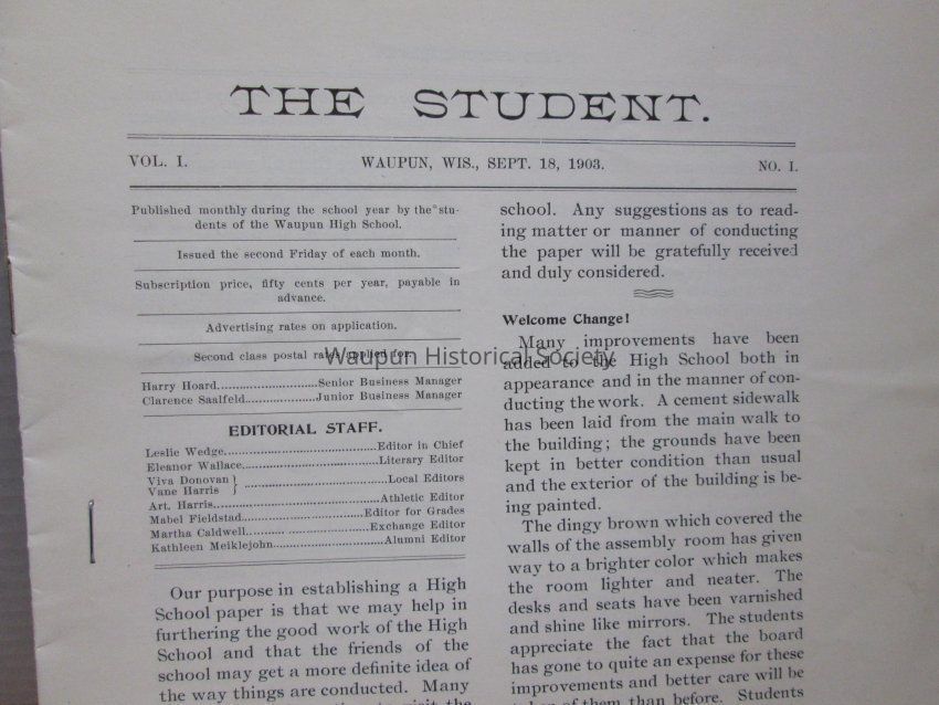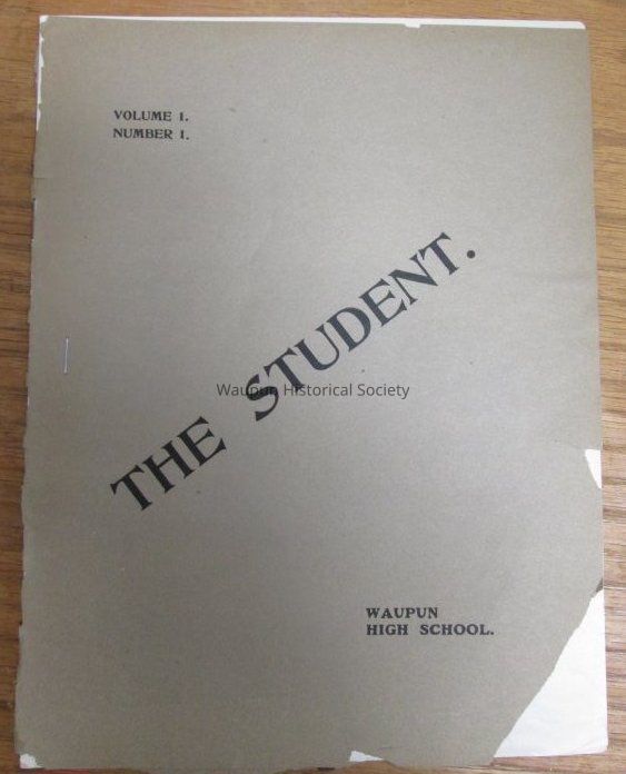 Volume 1 Number 1 "The Student" first month publication by the Waupun High school students in Sept 1903 Tan cover, 12 pages black print on white pageAcquisition