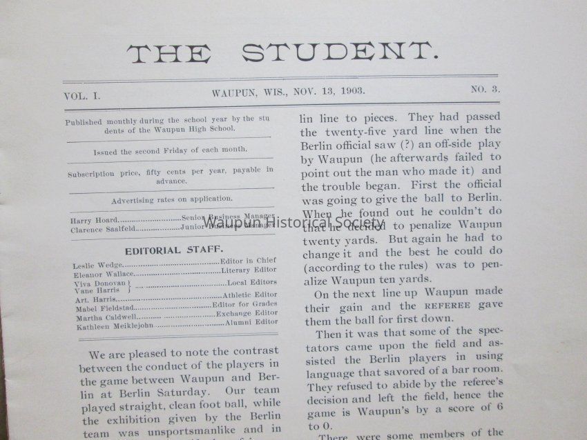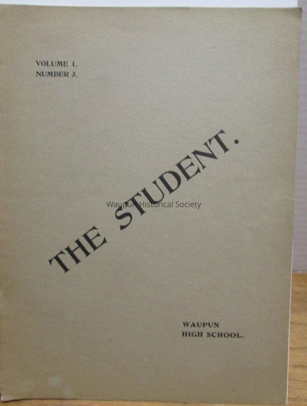 The Student vol.1, #3, publication by the Waupun High School students in Nov 1903. brown paper cover, white printed pages #25 thru 36Acquisition