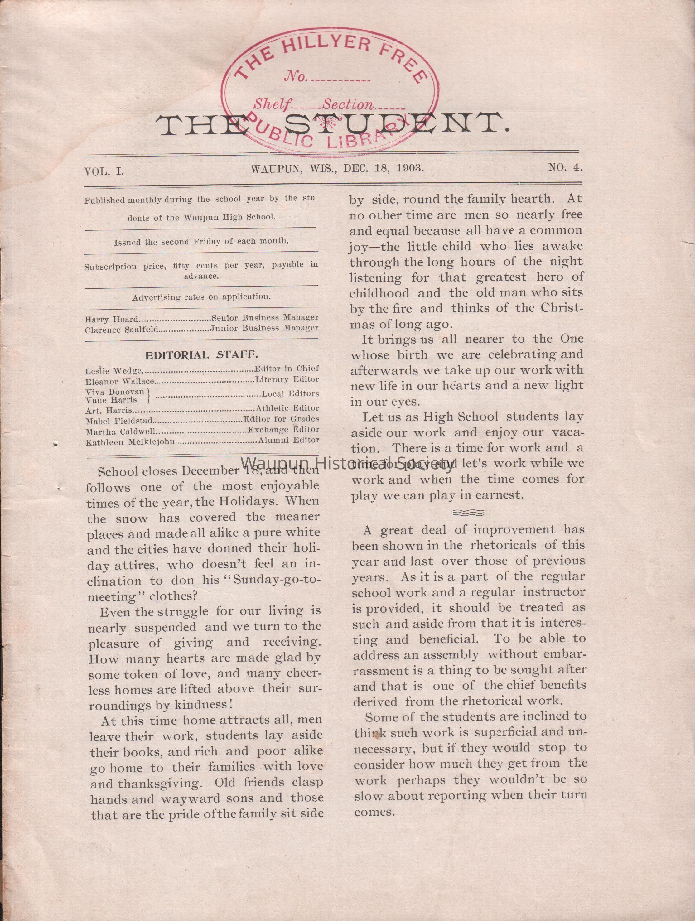Monthly publication by the Students of Waupun High school in Dec 1903. cover missing, white printed pages, #37 thru 48Acquisition