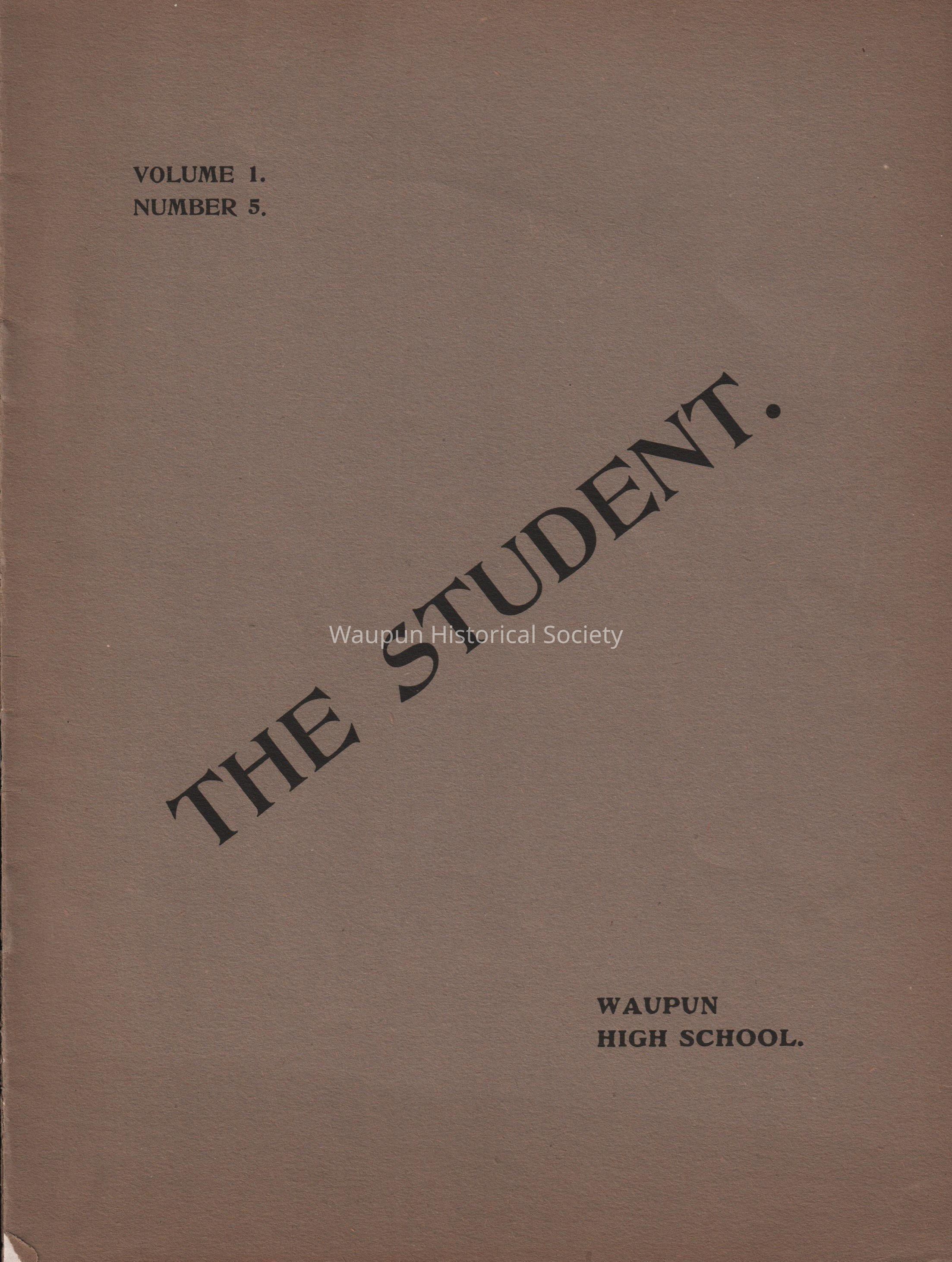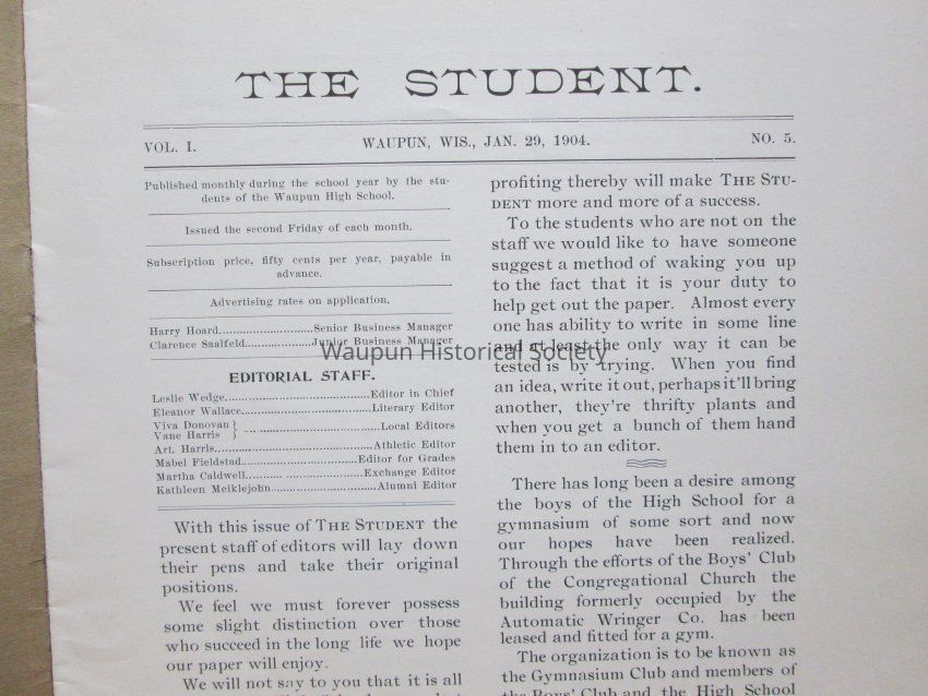 Waupun High school monthly student publication in Jan. 1904. faded tan paper cover, white pages with black print #49 thru 60Acquisition