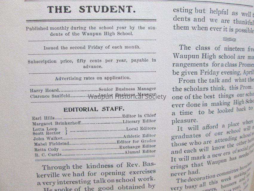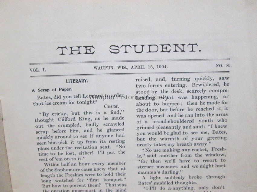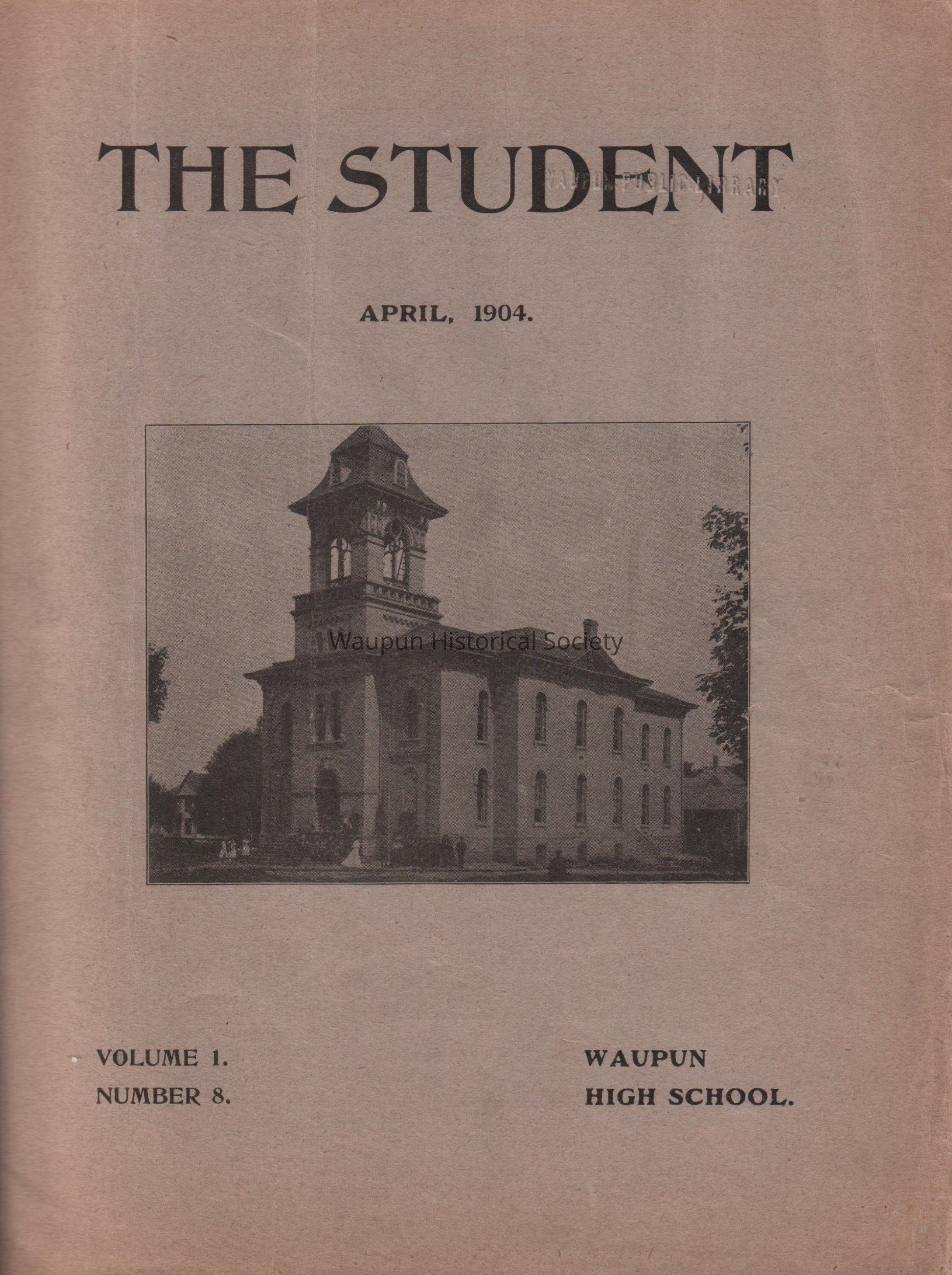 monthly publication by the students of Waupun High school Apr.1904, tan and black cover, white pages with black print # 85 thru 96Acquisition