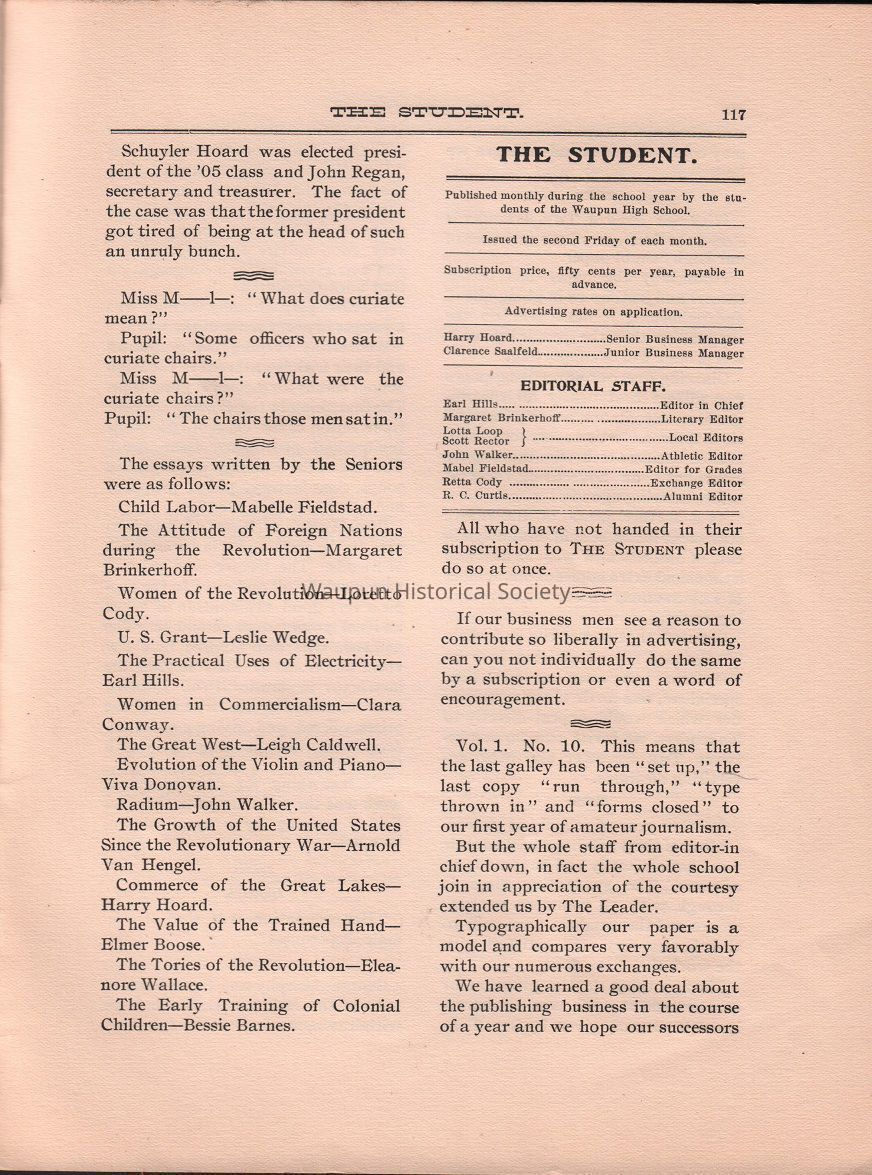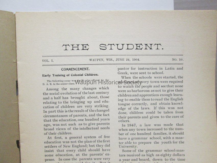 monthly publication by the students of Waupun High school in June 1904, Tan cover with black print, white pages with black print # 109 thru 122Acquisition