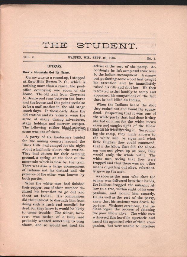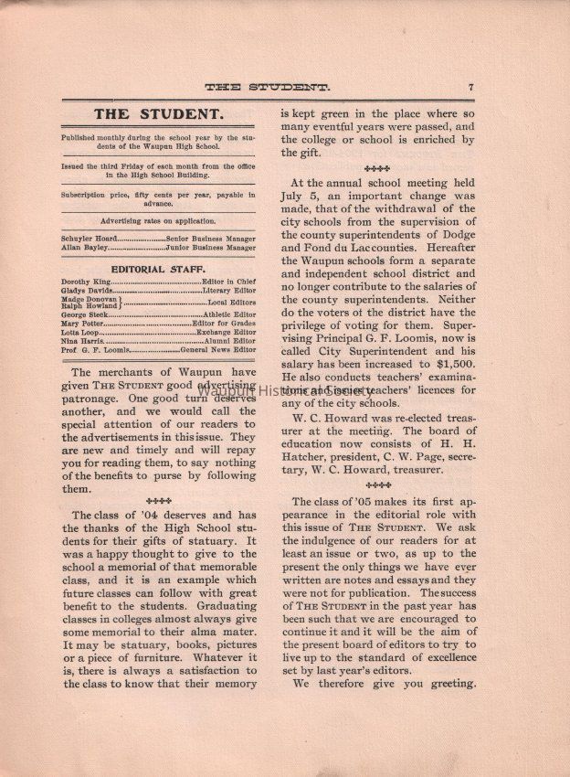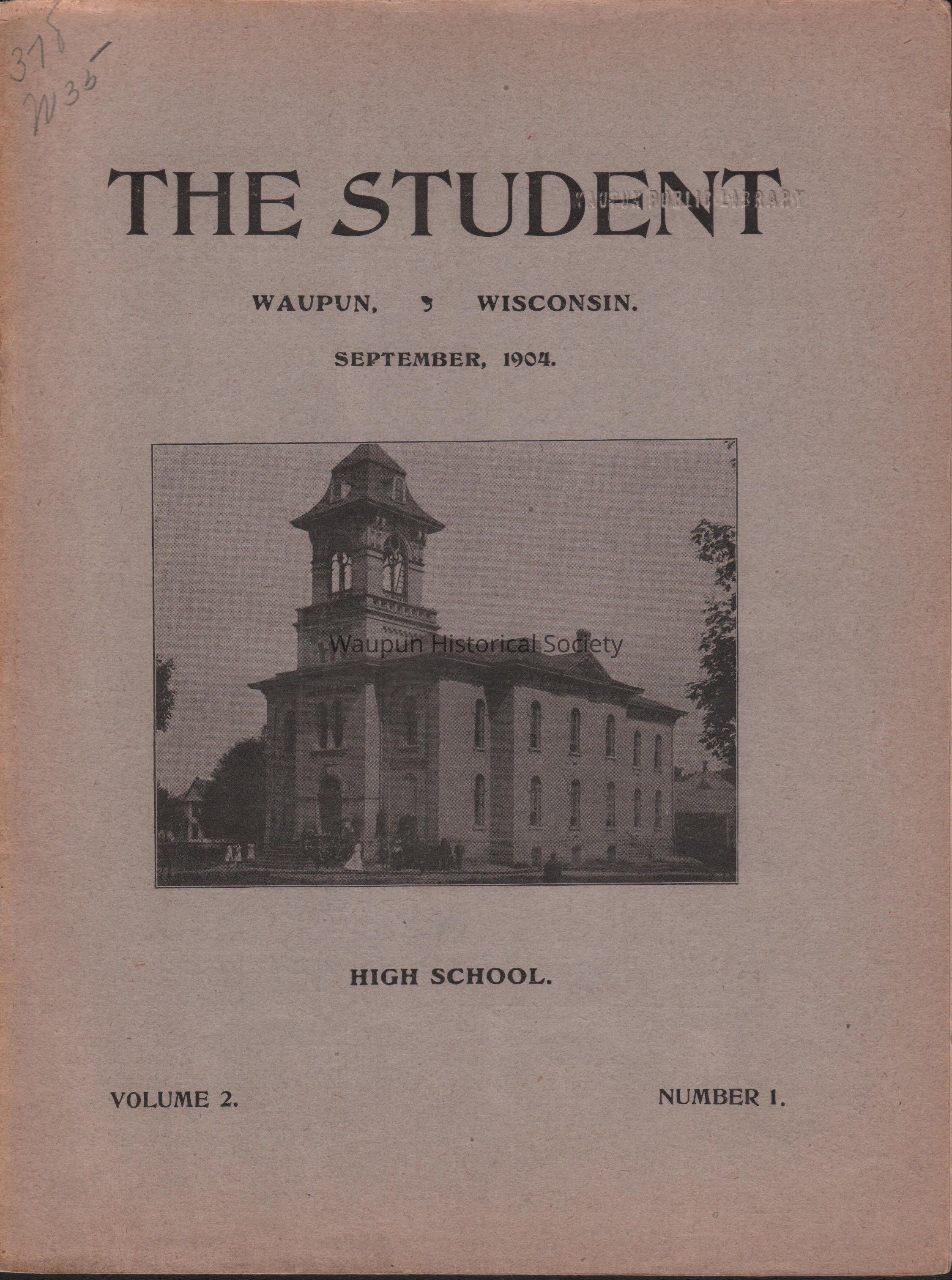 Monthly publication by the students of Waupun High school in Sept 1904, tan and black cover, white pages with black print # 1 thru 12Acquisition