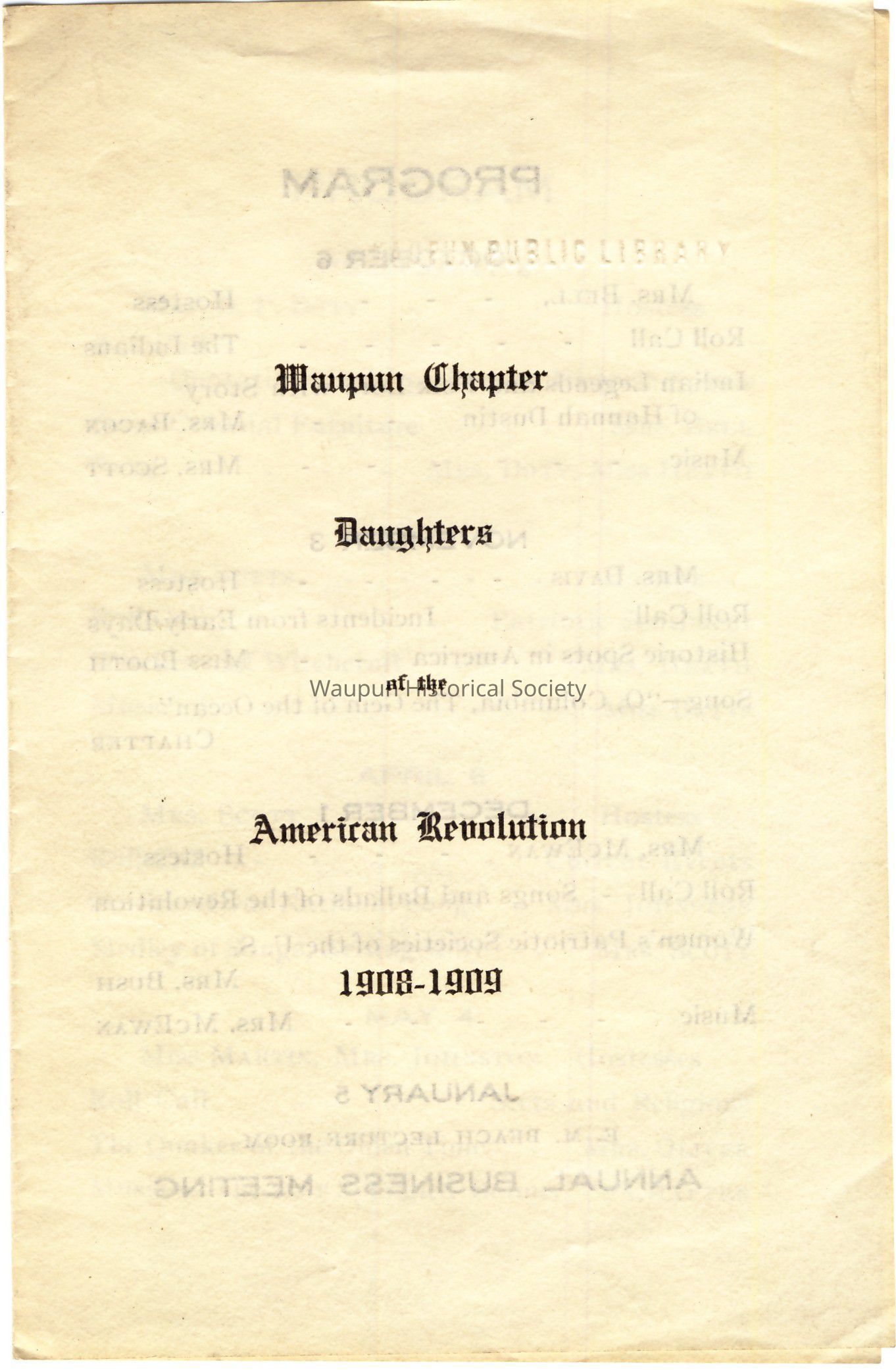 Program from Waupun Chapter of Daughters of the American Revolution dated 1908-1909. Indicates names of officers and other women involved.Acquisition